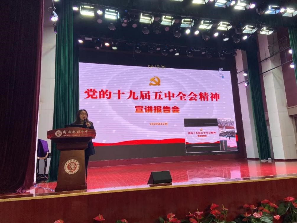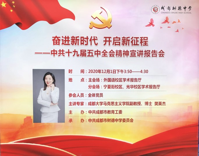 成都市教育系统宣讲队成员樊英杰副教授在树德中学(外国语校区)主讲,同时在宁夏校区、光华校区设置分会场同步收看、收听;樊教授重点讲述了全会的意义、会议的议程、《建议》的起草过程、《建议》的三大板块内容等,重点讲解并明确指出了学习贯彻十九届五中全会精神党和国家事业取得历史性成就和改革发展大事;我国发展环境面临的深刻复杂变化和“十四五”时期重要战略机遇期的新特征;新发展阶段、新发展理念、新发展格局的科学内涵和理论与实践逻辑;2035年远景目标和“十四五”时期发展的指导方针、主要目标、重点任务;党的领导是实现“十四五”规划和2035年远景目标的根本保证;学习领会省委贯彻落实党的十九届五中全会精神的重要部署;持续掀起学习贯彻热潮,推动全会精神在成都落地生根,开花结果等七个方面的要求。樊教授的讲解既有理论高度,又符合一线教育实际,与会党员同志深受启迪、深受鼓舞。