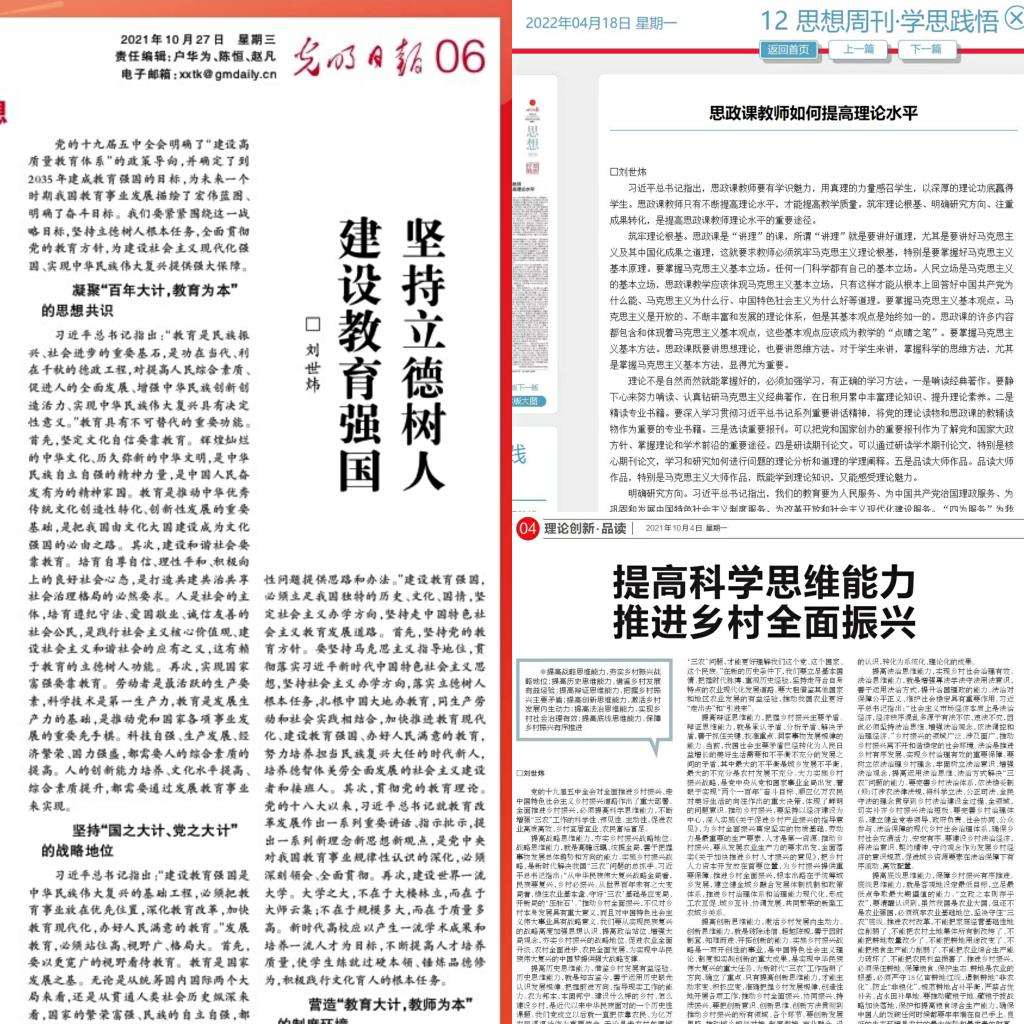 此前,刘世炜老师连续在光明日报、四川日报理论版发表文章,如2021年10月04日在四川日报理论版发表文章《提高科学思维能力 推进乡村全面振兴》,2021年10月27日在光明日报学习特刊发表文章《坚持立德树人 建设教育强国》,均是其有关方面研究成果。