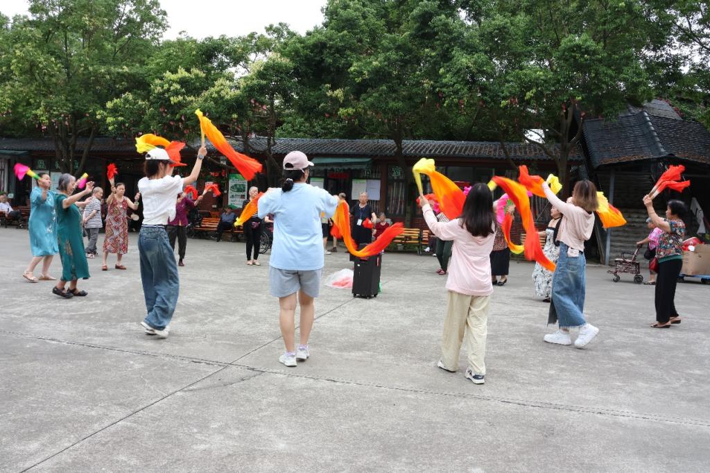 7月16日上午,实践团全体成员在养老院舞蹈老师的带领下与老年人共同跳广场舞以达到锻炼身体的目的 ,团队成员参与后,青春力量的注入吸引了更多老年人的加入,年轻一代与老年群体共同起舞,围绕着一个同心圆,相互配合,完成了一支又一支优美的舞蹈,跨越时代鸿沟,新老交融,每个人脸上都洋溢着欢乐的笑容。