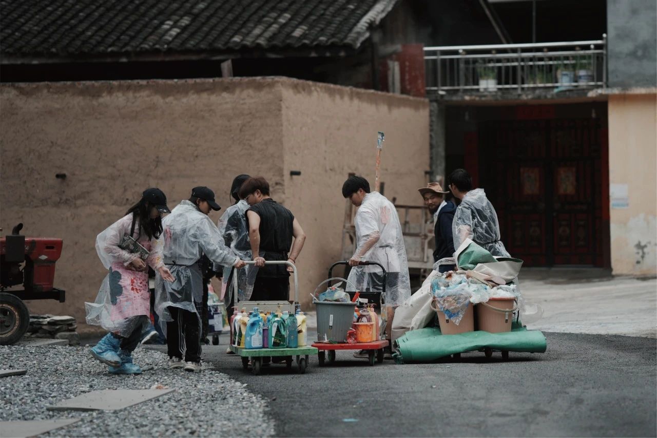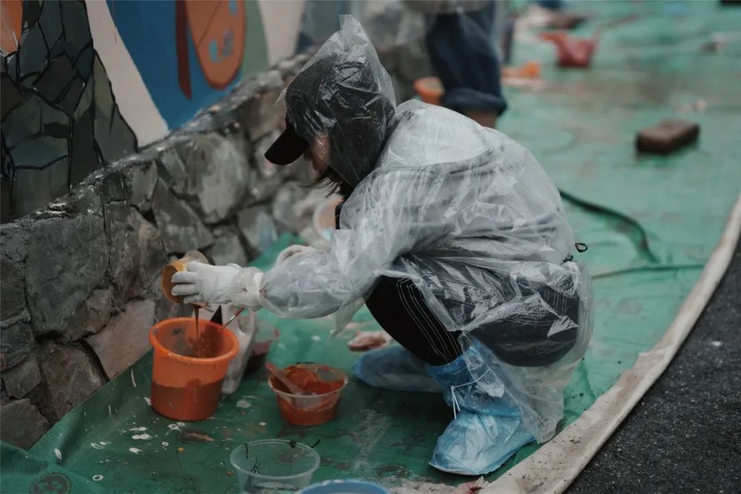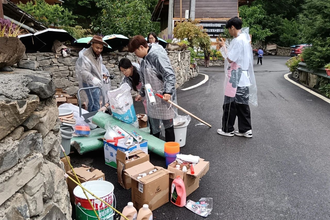实践队成员在墙绘完成后一起收拾材料、清理场地,确保地面干净如初,共同守护下双河村的清新与和谐。
