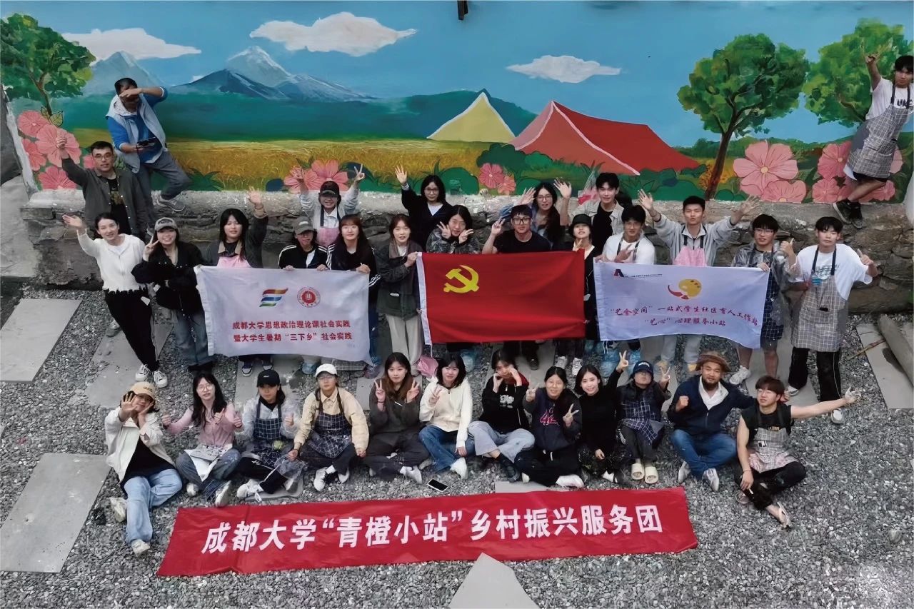 “文化赋能乡村,艺术振兴蓝图”暑期社会实践队集体合照。项目进入尾声,实践队全体成员在墙绘作品前拍照留念,全体成员热情向镜头招手。