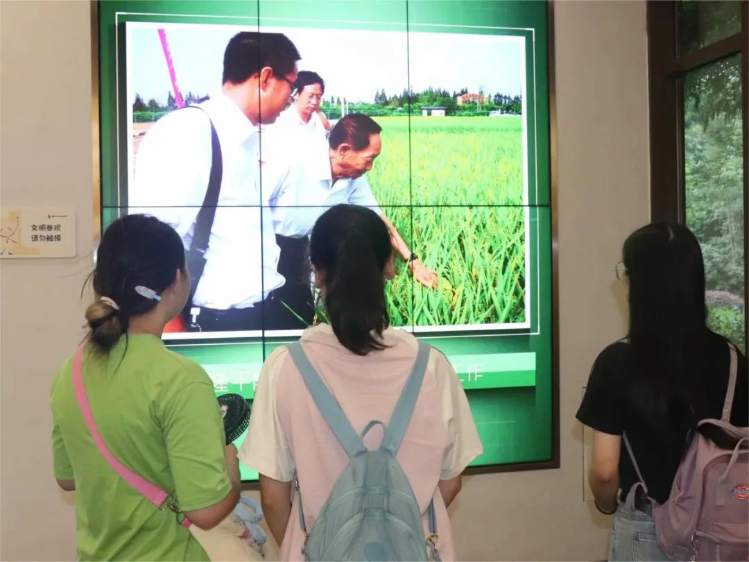 图为团队成员驻足观看袁隆平的相关影片。行至此处,团队成员们都默契地停留驻足观看,看着袁隆平院士研究杂交水稻时专注的模样,大家都深受触动。