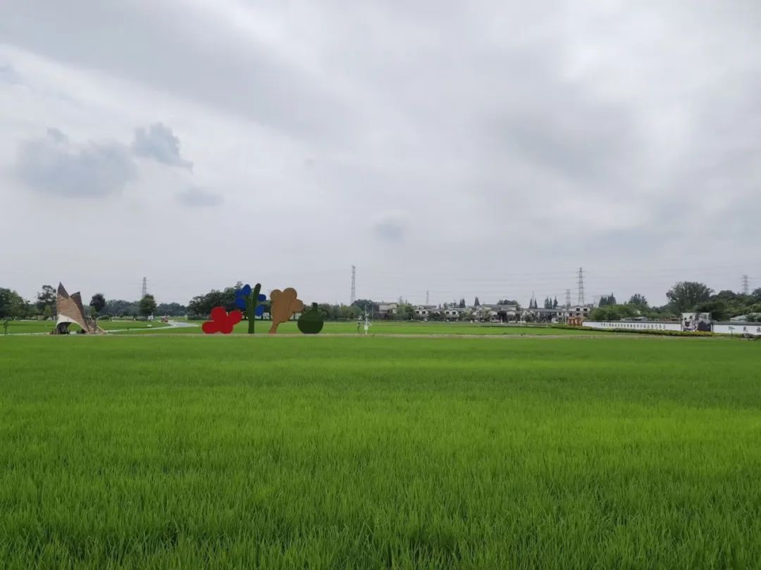 图为杂交水稻科技园区内的实验田。参观完场馆,实践团队来到户外进行参观,来到一大片试验田参观农田实验园区。实验田里的秧苗茁壮成长,层层绿涛,仿佛眼前已浮现出未来的金色麦浪,这足以体现杂交水稻的伟大之处。