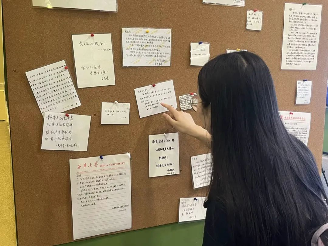 图为团队成员观看不同的人写给袁隆平院士的信和留言。展示栏上,贴满了写给袁隆平院士的留言,大学生,小孩子,党员,普通百姓等等,展现出人们对袁隆平院士最真挚的崇拜与敬爱。