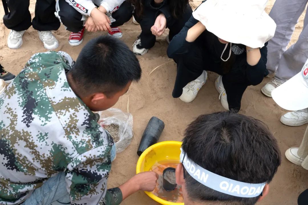 公益治沙人仲麟正在给同学们演示杯苗实验,通过杯苗的方式来培育出生活力强的沙漠苗木,大大提高苗木的质量和成活率。团队成员们围在一旁仔细学习,并在后续上手实验。