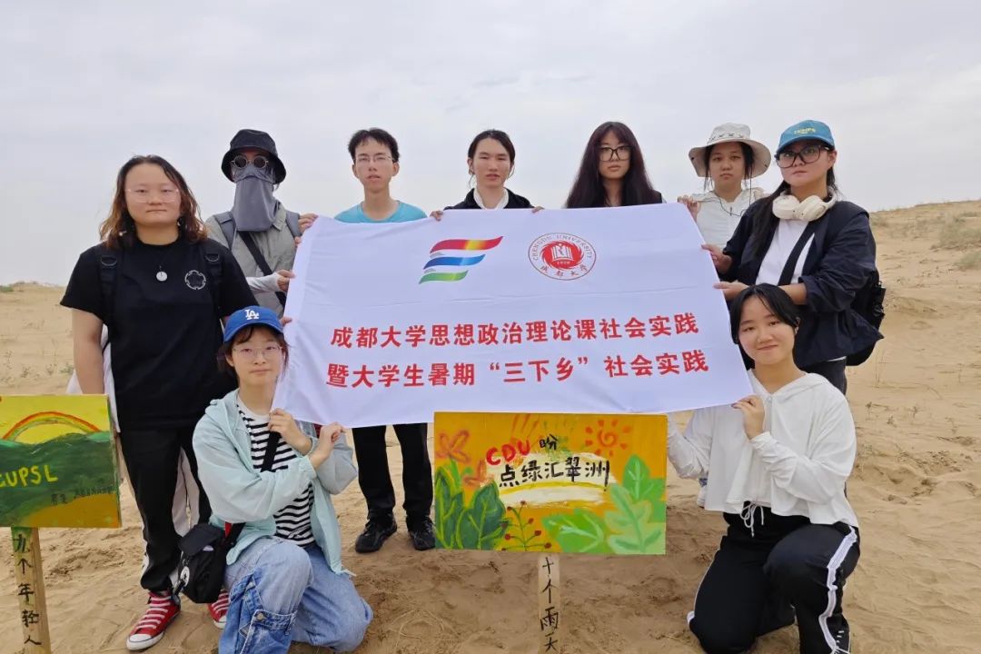 团队成员们在携手绘制的立牌前留下合影。“点绿汇翠洲”是团队成员对民勤的美好期盼和奋斗口号,并希望以自己的实际行动带动更多的人关注和参与民勤的治沙事业,因为个人贡献的小小绿意就能汇聚一片生机勃勃的翠洲。