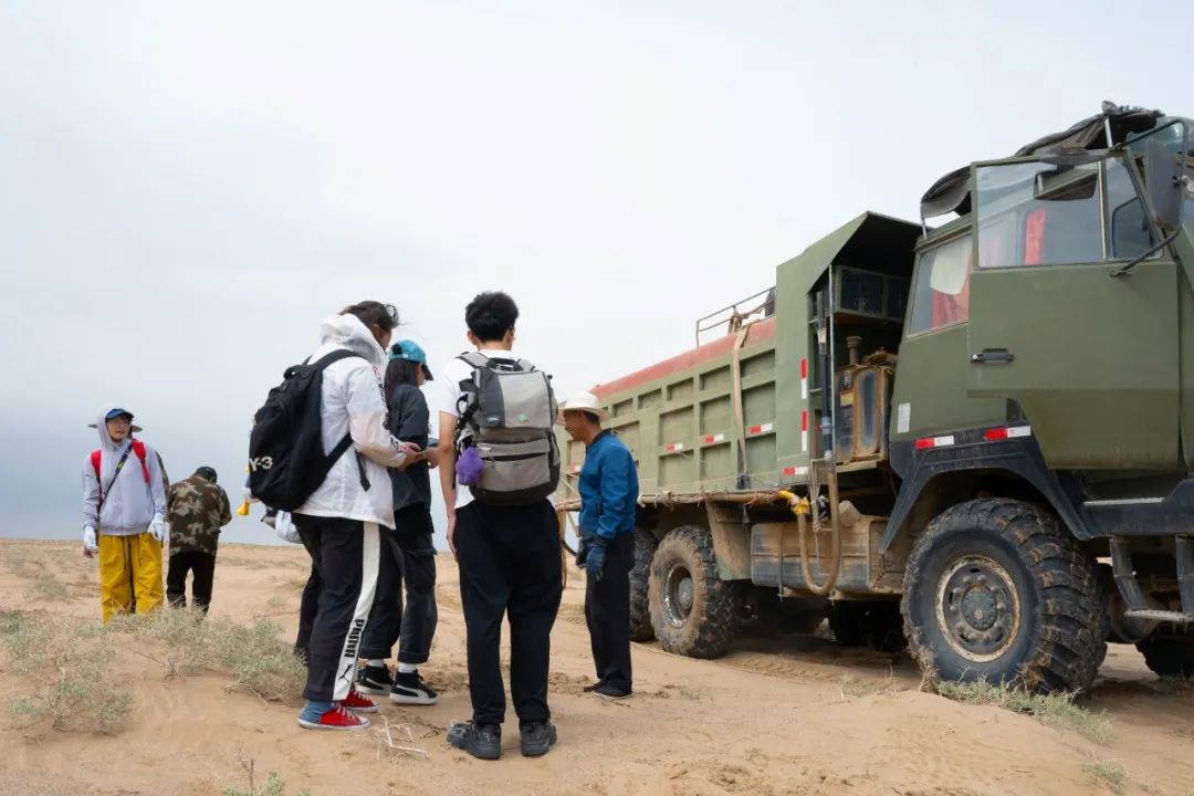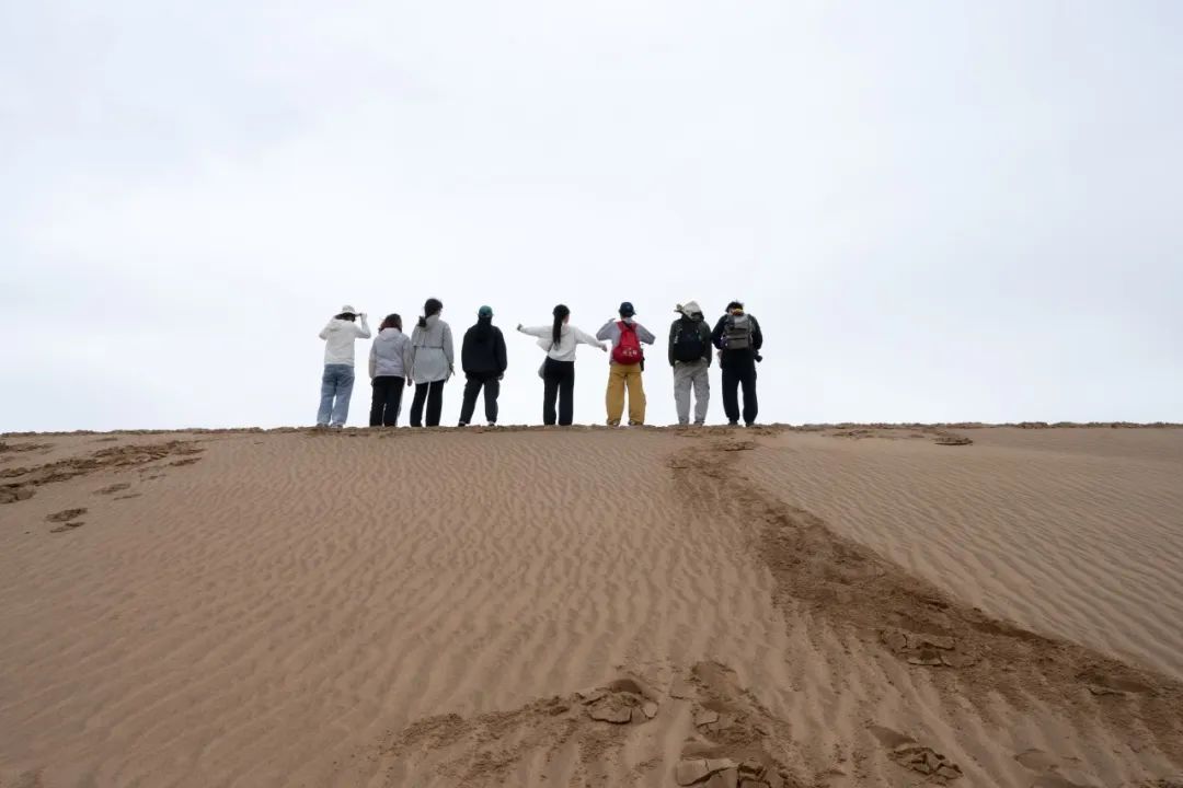 高铁转大巴再转沙漠越野,一天的舟车劳顿,实践团终于在傍晚抵达甘肃省武威市民勤县——一个深陷于腾格里沙漠与巴丹吉林沙漠之间的绿洲。队员们站在沙丘之上,面对茫茫大漠,留下这张合照。