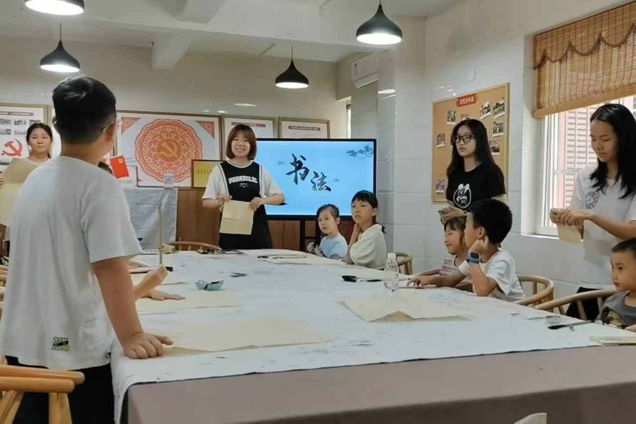 志愿者走进社区以生动PPT为媒介,图文并茂生动有趣,引领小朋友们踏入书法艺术的殿堂,并通过互动问答间激发孩子们对墨香文化的浓厚兴趣,共绘知识传承的美好画卷