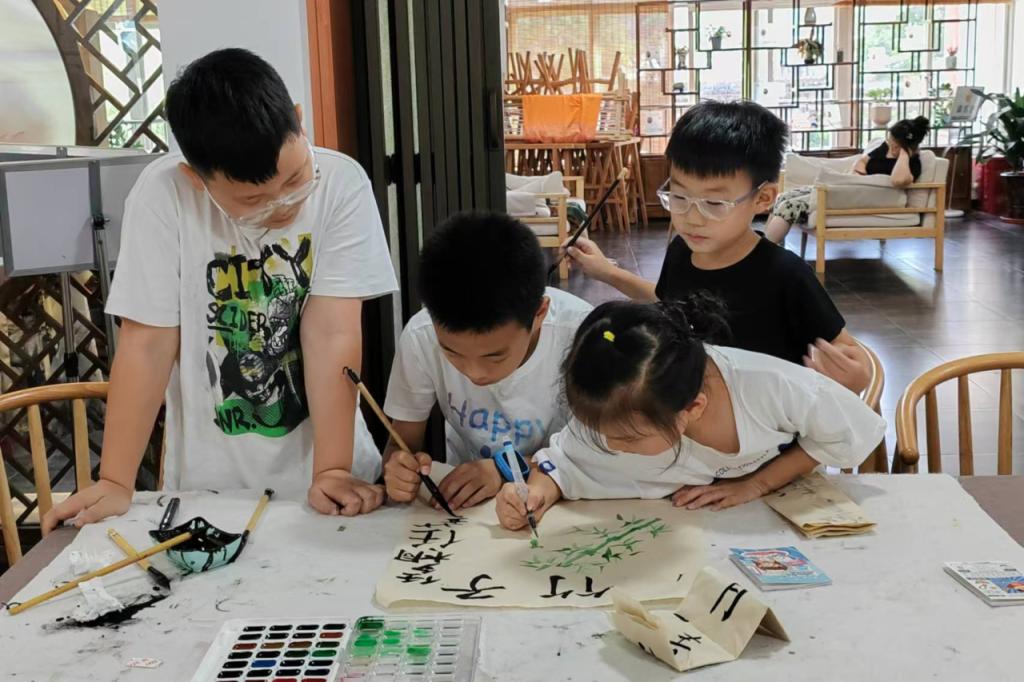 孩子们围在一起,手握着毛笔,沉浸在创作的乐趣中。他们的笔触虽显稚嫩,却饱含纯真与想象,展现了孩子们丰富的内心世界和对美的追求以及对书法的热情。