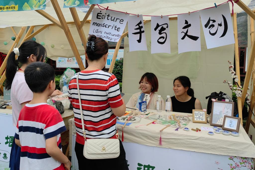 在清波社区的中法交流活动中,志愿者自行动手制作了精美的书法文创并通过友好市集向法国大学生和游客们传播中国书法,弘扬中国优秀传统文化,吸引了众多法国参观大学生的目光。