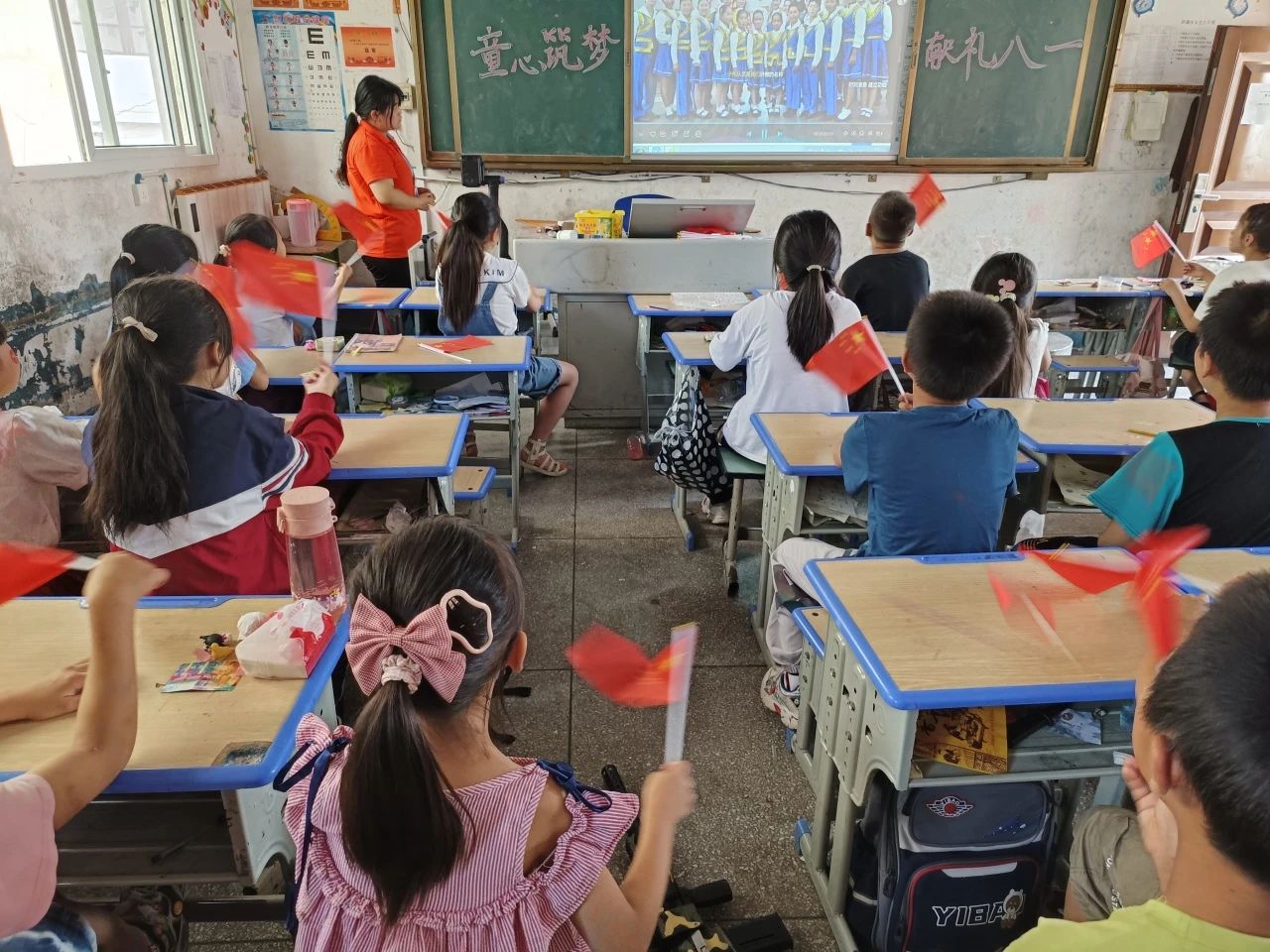 8月1日当天,团队成员为学生们讲解国旗的组成和来历,并一起唱国歌,学敬礼。了解军队的发展历程,学习军人的精神。最后让学生们在纸上动手画一画国旗。