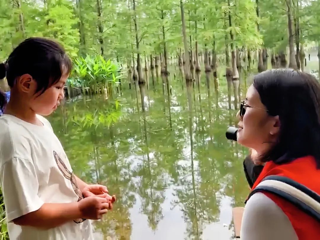 图为团队成员小雷采访来白鹭湾湿地公园游玩的小朋友,就公园有什么改变等问题进行询问,小朋友回答:感觉公园的生态变得更好了,能看到更多的国家级保护动物,林木覆盖面积也变更多了。
