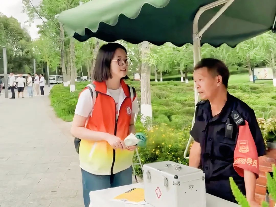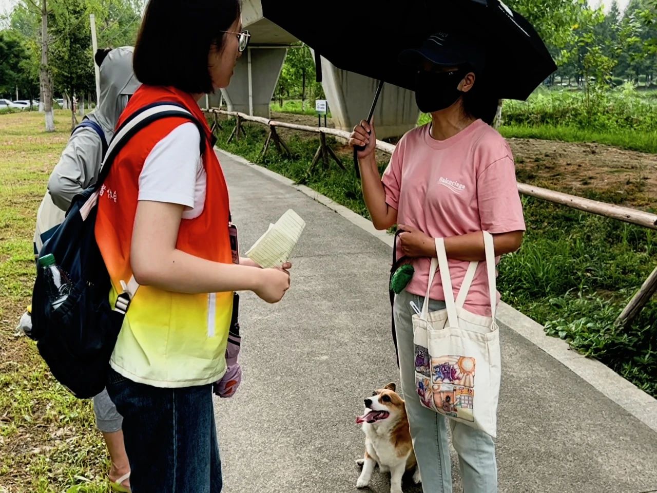 图为团队成员小雷采访正在白鹭湾湿地公园遛狗的小姐姐,小雷就湿地公园如果设立管理宠物不文明行为的处罚措施,如罚款、屏幕公示进行询问,得到了小姐姐肯定的答复:“建设湿地公园需要大家的理解和支持嘛”。
