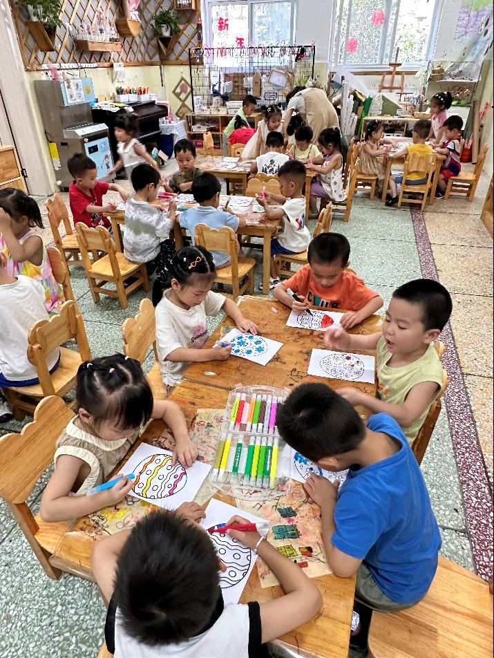 这节美术课上,小朋友们根据自己的想象画出心目中的多彩的恐龙蛋,小朋友的世界本就是多姿多彩的,多彩的恐龙蛋绘画是孩子们丰富内心世界的展现。