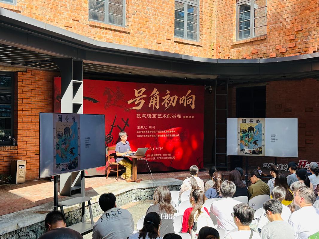 活动第三阶段,师生们在报博馆院子里的银杏树下,共同聆听了四川省美术家协会连环画漫画艺委会秘书长、成都市美术家协会连环画动漫艺委会常务副主任刘可老师带来的“号角初响——抗战漫画艺术的兴起”主题讲座。刘可老师讲道,“抗战漫画运动是抗日战争期间,中国漫画家以画笔为武器,积极投身救亡图存的民族战争、推动抗战胜利的重要宣传行动,更是抗日文化救亡运动的关键组成部分。”
