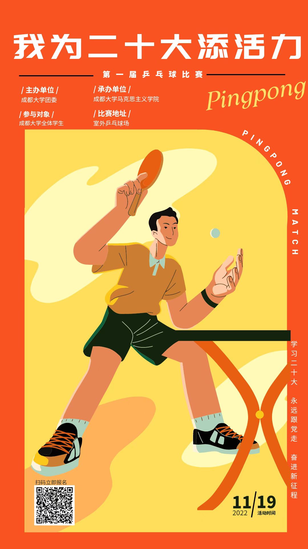 为丰富学生的校园文化生活,全面发展学生身体素质,由香蕉视频 团委主办、香蕉视频 承办的“学习二十大,永远跟党走,奋进新征程”——“我为二十大添活力”第一届乒乓球赛拟于11月19日(周六)8:30-12:00和14:00-17:00在室外乒乓球场举行。请各学院积极组织学生参赛。