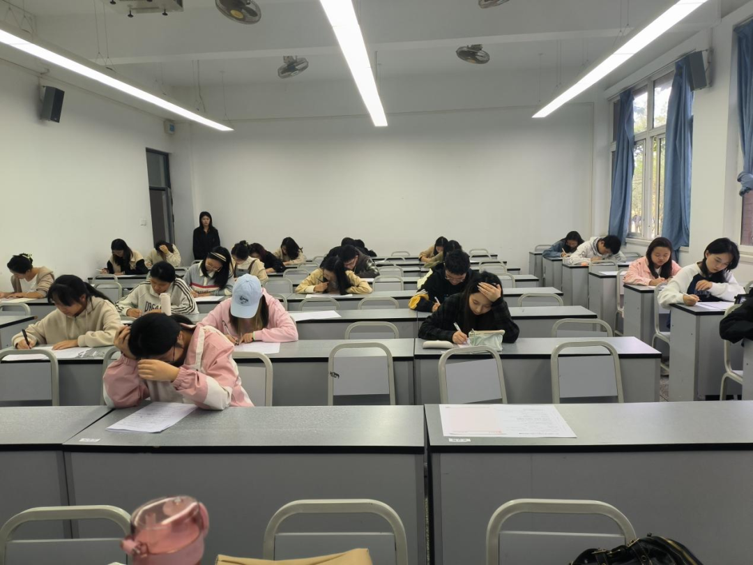 监考员宣布考试开始,准时发卷,各位考生拿起笔全神贯注地答题,监考员按要求观察考场情况。