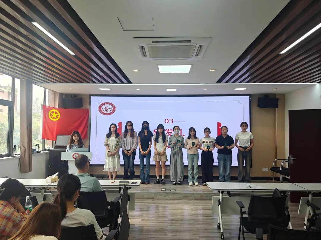 入团仪式在激昂的国歌声中正式开启,全体参会人员神情肃穆,齐声高唱国歌,现场气氛庄重而热烈。随后,主持人郑重宣布新团员名单,学院分团委书记刘瑶琦老师逐一为新团员颁发团员证和团徽。在胡万春同学的领誓下,新团员们面向团旗,右手握拳,庄严宣誓,表达了对加入共青团的坚定决心和为共产主义事业奋斗终身的忠诚信念。
