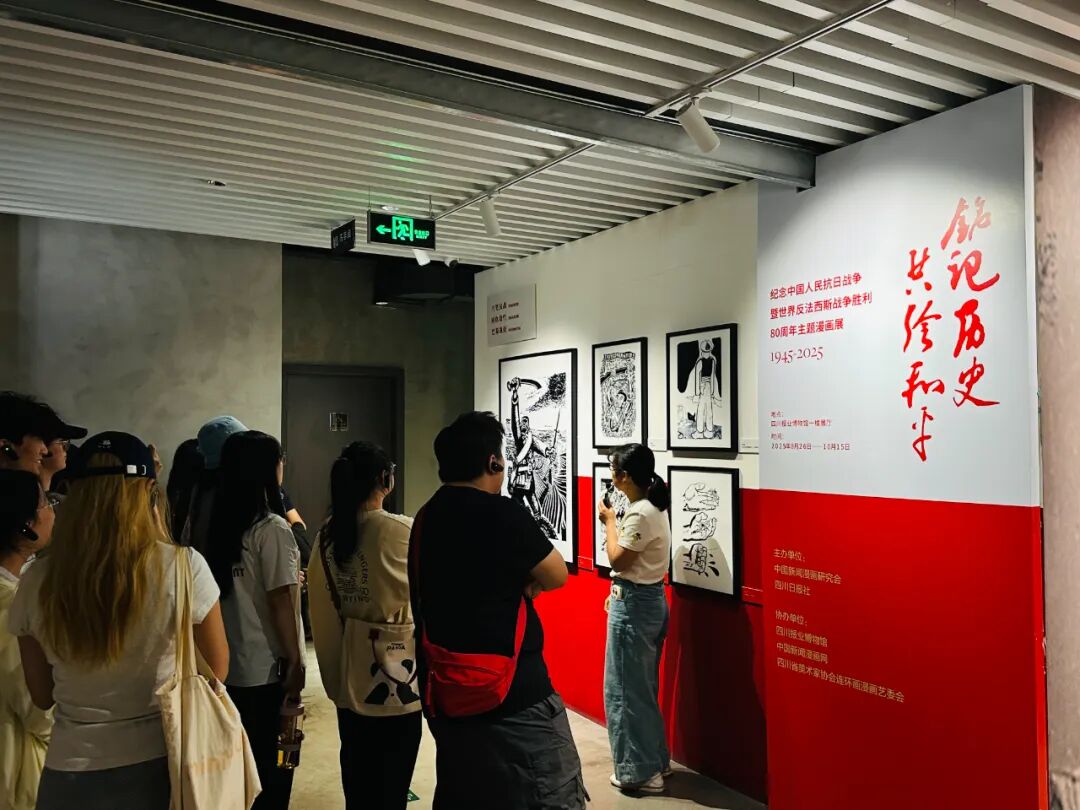 今年正值中国人民抗日战争暨世界反法西斯战争胜利80周年。在活动第二阶段,同学们跟随讲解员老师,一同参观了由中国新闻漫画研究会和四川日报社主办的“铭记历史 共绘和平”纪念抗战胜利80周年主题漫画展。展厅内,八十幅漫画作品沿墙展开,华君武、丁聪、叶浅予等中国漫画巨匠,与苏联叶菲莫夫等国际漫画家的杰作交相辉映。这些作品被精心划分为“刀笔抗战”“同仇敌忾”“巴蜀战鼓”三大板块,共同构筑了一部震撼人心的“视觉抗战史诗”。同学们在观展过程中,真切感受到了每一幅漫画背后所蕴含的抗战时期中国艺术家的奋斗精神与责任担当。