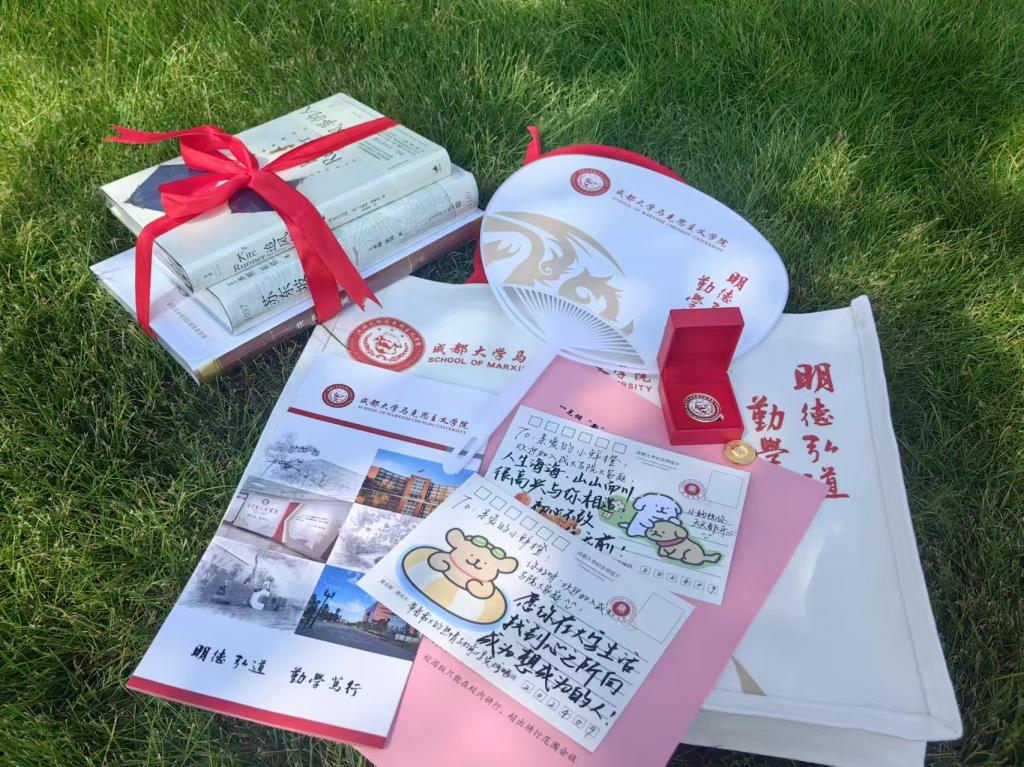 为了更好地迎接马院的小鲜橙们,学院特意准备了“新生礼包”。礼包里不仅有专属2024级小鲜橙们的马院院服、院徽、学院帆布包、学院定制笔记本、扇子、矿泉水、新生温馨提醒单,还有学长学姐们精心准备的明信片。满满当当的新生大礼包蕴含着马院最诚挚的关怀。