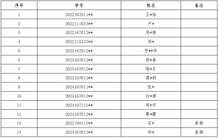本专科生国家奖学金管理办法(修订)》等文件精神和要求,经学生自主申报、资格初审、材料审核、学院国家奖助学金评审工作小组审议等环节,拟推荐王*怡等14人为2025年国家励志奖学金推荐人选,其中包含差额2人,现将拟推荐名单公示如下: