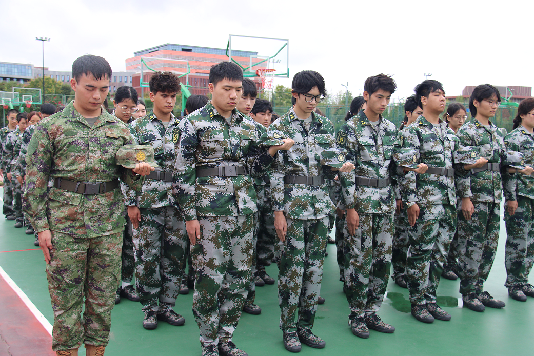训练场上,一营四连的同学们目光如炬,纹丝不动,用挺拔身姿展现出马院风采。上午十时,凌厉而沉重的防空警报划破长空,响彻神州大地。训练场上的全体新生、教官脱帽垂首,为九十多年前在苦难中逝去的同胞默哀,向奋起抗争的革命先烈致敬。