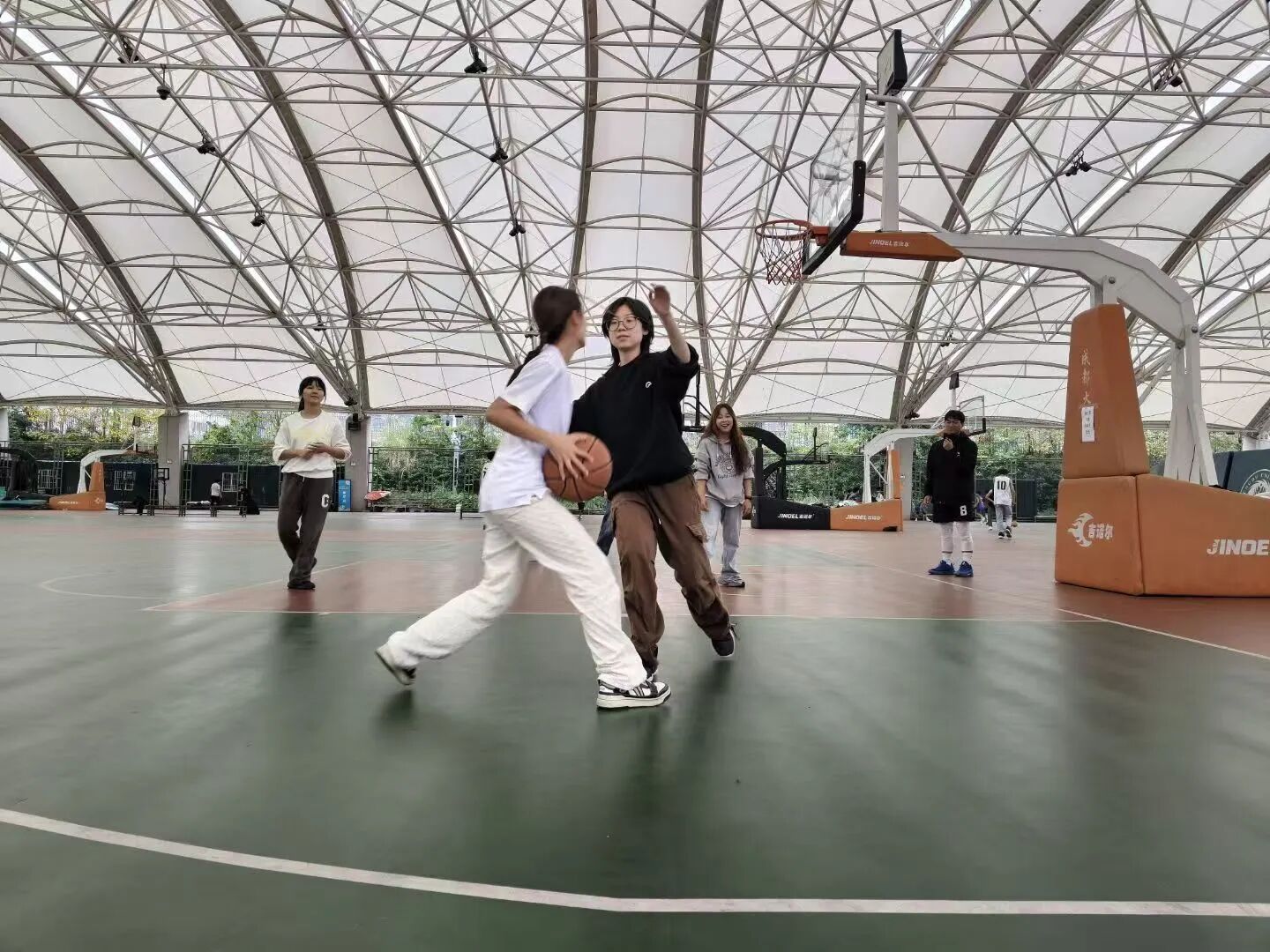 赛场上,女球员的表现格外亮眼。进攻时默契,防守时紧密站位,偶尔出现的精彩两分和巧妙助攻。比赛无关输赢,更像是一堂生动的集体实践课,完美诠释了马院学子团结协作的精神。