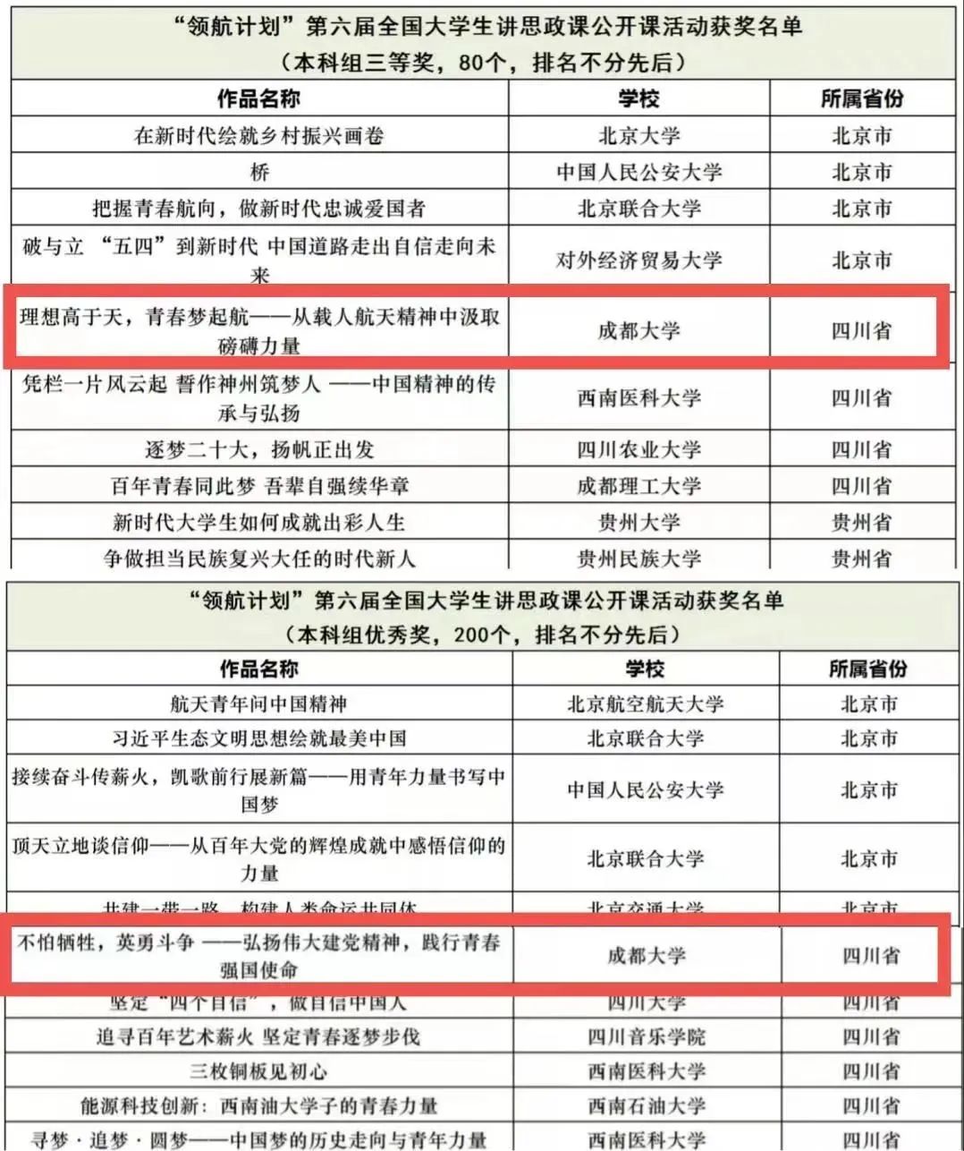 此前,在四川高校大学生讲思政课公开课展示活动中《理想高于天,青春梦起航——从载人航天精神中汲取磅礴力量》和《不怕牺牲,英勇斗争——弘扬建党精神,践行青春强国使命》荣获四川省一等奖、《用好“社会大课堂”,放飞青春梦想》荣获四川省二等奖。