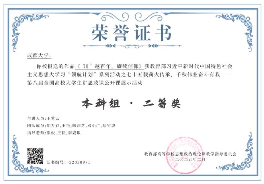 漆俊、王佳、李姿垠三位老师共同指导,王紫云、胡万春、王艳、陶润芝、邓小广、师宁波组成的学生团队凭借作品《“川”越百年,赓续信仰》脱颖而出,荣获本科组全国二等奖,充分展现了香蕉视频