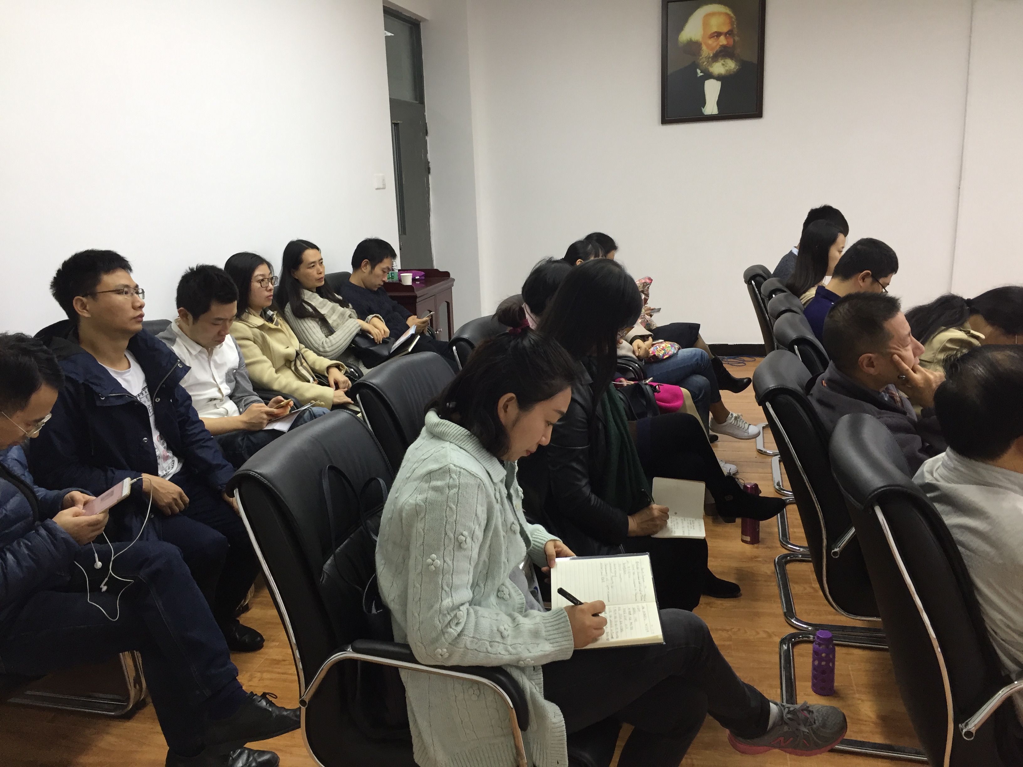 在自由发言阶段,在座老师踊跃发言,政治学院副院长岳鹏谈到,十九大报告鼓舞人心,催人奋进,习近平新时代中国特色社会主义思想写入党章是党在新时代做出的重大决定,指引了党和国家前进的方向,在今后的教学和工作中一定要以十九大精神武装头脑、指导实践。