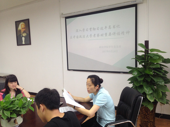 杨老师首先传达了《中共教育部党组关于学习贯彻习近平总书记在中国政法大学考察时重要讲话精神的通知》要求,然后就习近平总书记在“五四”前夕前往中国政法大学时的的讲话内容进行了解读。习近平总书记的讲话围绕勉励同学们珍惜韶华,潜心读书,全面成长成才;坚定信念跟党走,培养高素质法制工作队伍,实现全面依法治国等内容,和教育工作者、法治工作者、青年学生话青春谈初心讲法治。通过对讲话精神的学习和讨论,党员们一致认为:总书记站在全面依法治国的战略高度,为培养法治人才明确路径,为青年成长指明方向,激荡起广大学生奋发向上的青春力量,为推动法治中国建设注入了强劲动力。大家作为法科学生深受鼓舞,也感到了自己肩负的重任,在以后的学习生活中,不断提高自己的专业学习水平,不忘初心跟党走,为全面实现依法治国贡献自己的力量。