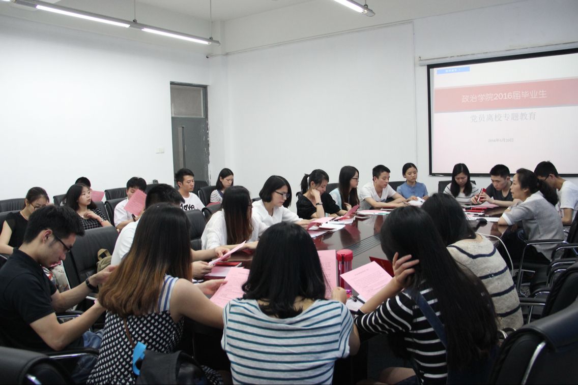 5月20日下午14:30,,政治学院学生党员“两学一做”学习动员会暨毕业生党员离校教育活动在6224学院会议室举行,全体毕业生党员参加学习。