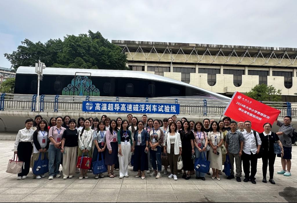 等高校的专家教授进行专题讲座,并赴西南交通大学附属中学开展现场教学。培训内容丰富实用,培训形式新颖多样。阎钢教授以参加“3.18”学校思政课教师座谈会的亲身经历告诉思政课教师要明确自己的责任与担当;范锡文教授从“具备理解思政课一体化涵义的战略视野、拥有深度解读思政课一体化的职业敏感、涵养思政课一体化教育的学科核心素养”三个方面诠释作为一名思政教师应具备的专业素养;李春梅教授从背景、主要内容、主要亮点等方面对“大思政课”建设工作方案进行解读;王蓉教授结合具体的案例为学员分析新媒体环境下信息传播特点、面临挑战及网络舆情研判与处置的方法策略;安鸿书记从学透谨守《中国共产党纪律处分条例》、严守师德师风规定、增强纪律意识提升师德师风水平等方面引导学员做政治强、情怀深、思维新、视野广、自律严、人格正的思政课教师;西南交大附中雷国胜书记作“‘竢实’之下,‘扬华’初现”学校教育品牌创建介绍;杨伶主任以“互学共研聚合力,一体化思政育新人”为题分享大思政、一体化建设的实践经验,随后学员们现场参观西南交通大学高温超导高速磁浮工程样车及实验项目基地,感受科技创新引领下的大国重器。