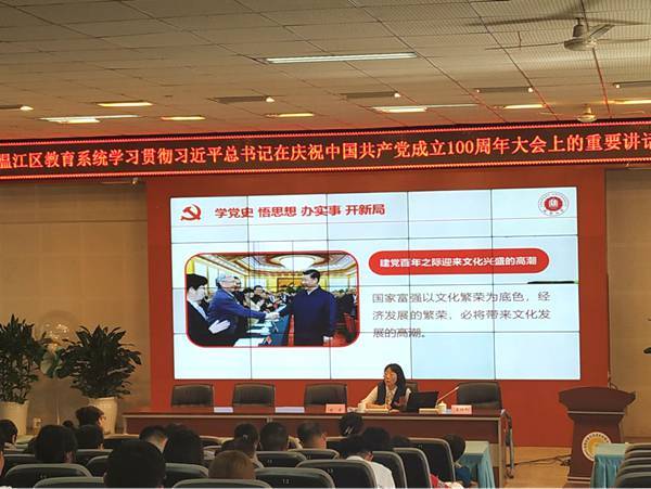 为深入学习贯彻习近平总书记在庆祝中国共产党成立100周年大会上的重要讲话精神,9月27日下午,温江区教育局在光华实验小学校至美报告厅召开区教育系统党史学习教育暨近期重点工作部署会,全区各中小学、幼儿园、部分教育培训机构党组织书记和党务工作者60余人参加会议。