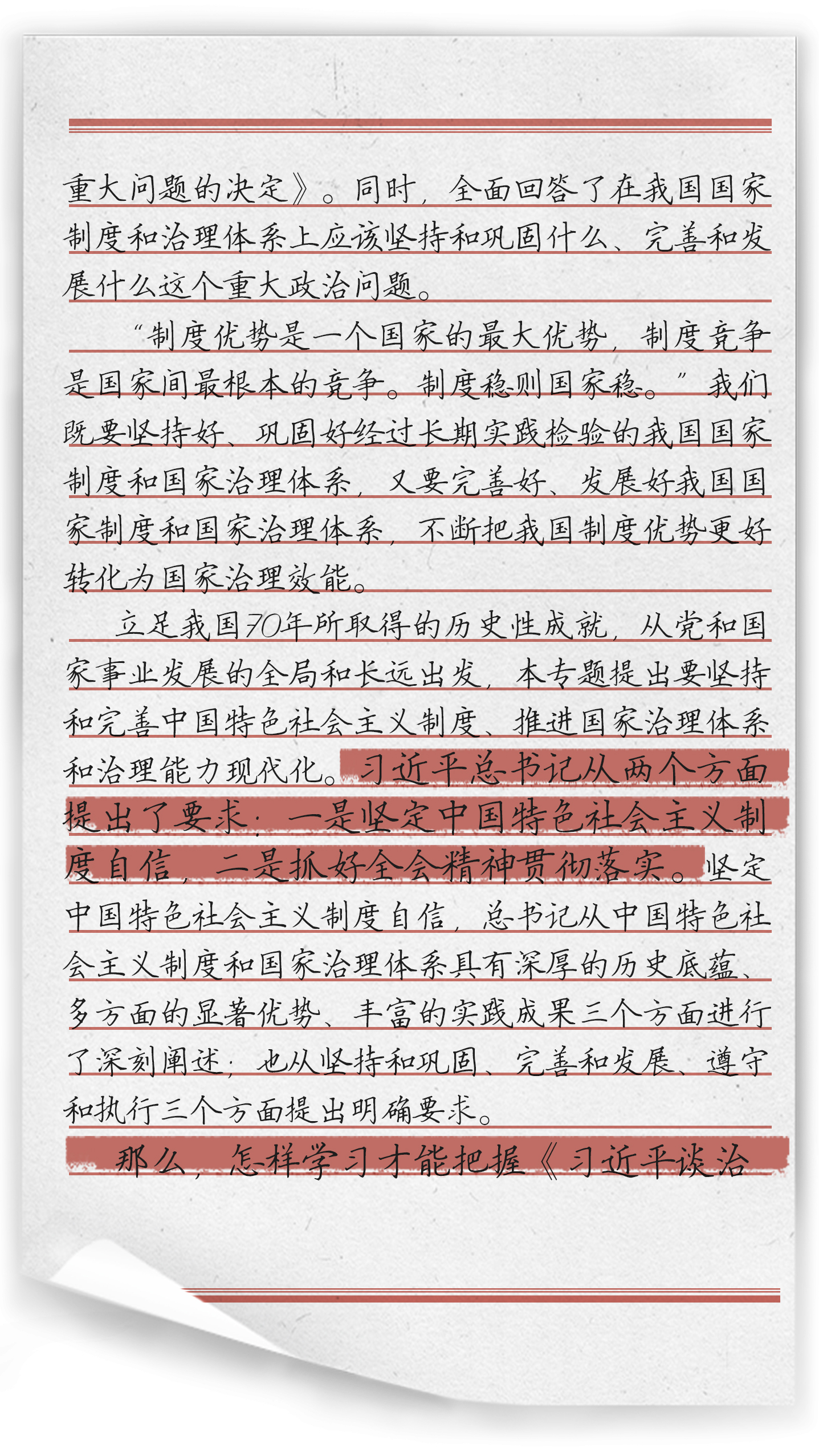 “完善和发展我国国家制度和治理体系” 作为《习近平谈治国理政》第三卷的第三专题,共收录习近平总书记2019年7月至2019年10月期间的3篇讲话或讲话要点、节选。这一系列讲话是以习近平同志为核心的中共中央,贯彻落实党的十九大决策部署的一个重要举措。从党和国家事业发展的全局和长远出发,坚持和发展中国特色社会主义制度、推进国家治理体系和治理能力现代化问题。这是从政治上、全局上、战略上的全面考量,也是立足当前、着眼长远作出的重大决策。同时,全面回答了在我国国家制度和治理体系上应该坚持和巩固什么、完善和发展什么这个重大政治问题。