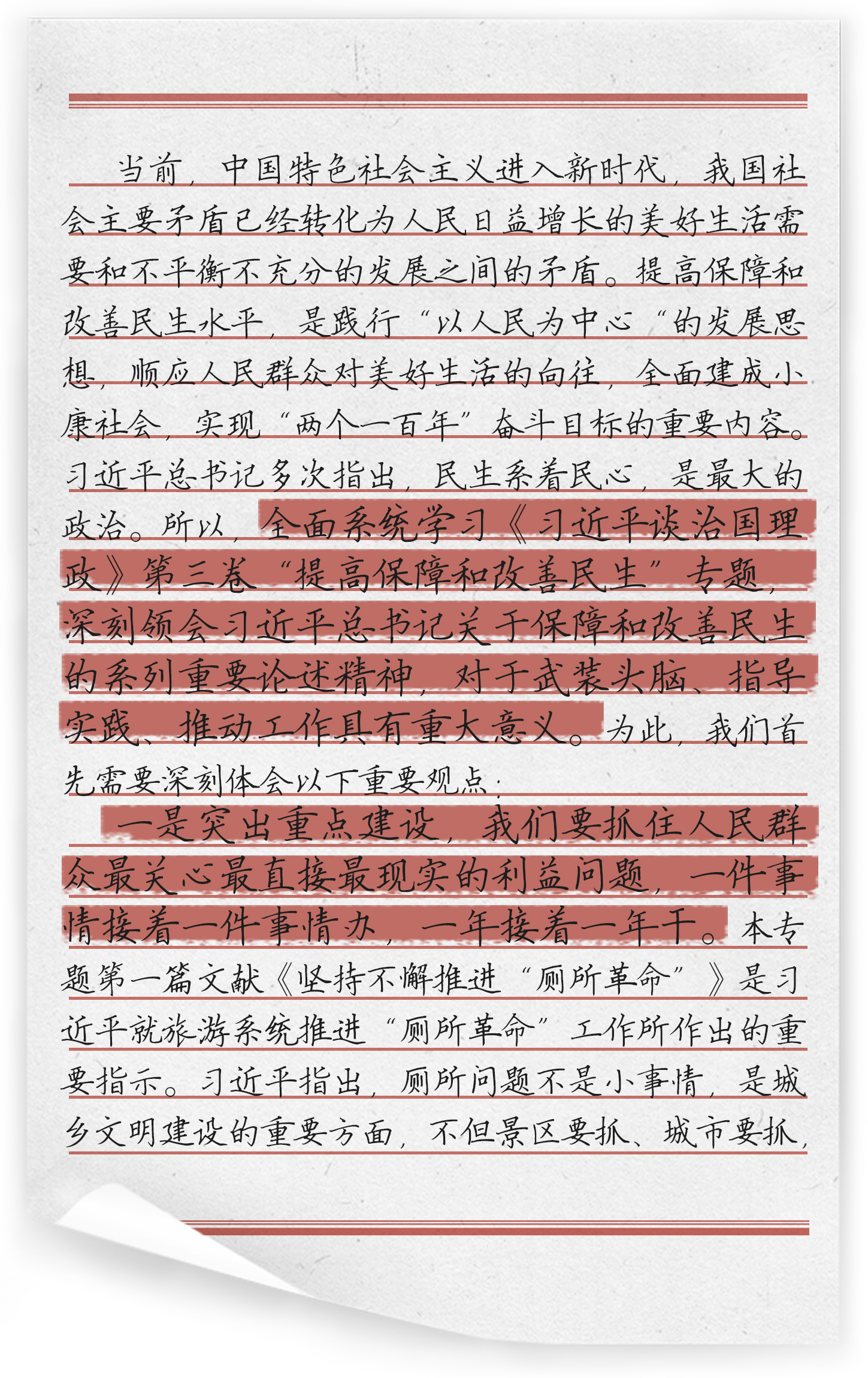 人民是党执政的最大底气,也是党执政最深厚的根基。习近平总书记始终以人民为中心,把人民放在心中最高位置,党的十九大以来,习近平总书记基于新时代民生建设面临的新情况、新问题、新任务和新目标,对保障和改善民生作出系列重要论述。在《习近平谈治国理政》第三卷中,保障和改善民生的精神和要求贯穿全书。其中,尤其以第十二部分最为集中,该专题以“提高保障和改善民生水平”为名,主要收录了习近平总书记自2017年11月至2019年11月期间关于保障和改善民生的讲话或讲话要点、指示要点等,汇编形成了四篇文献。