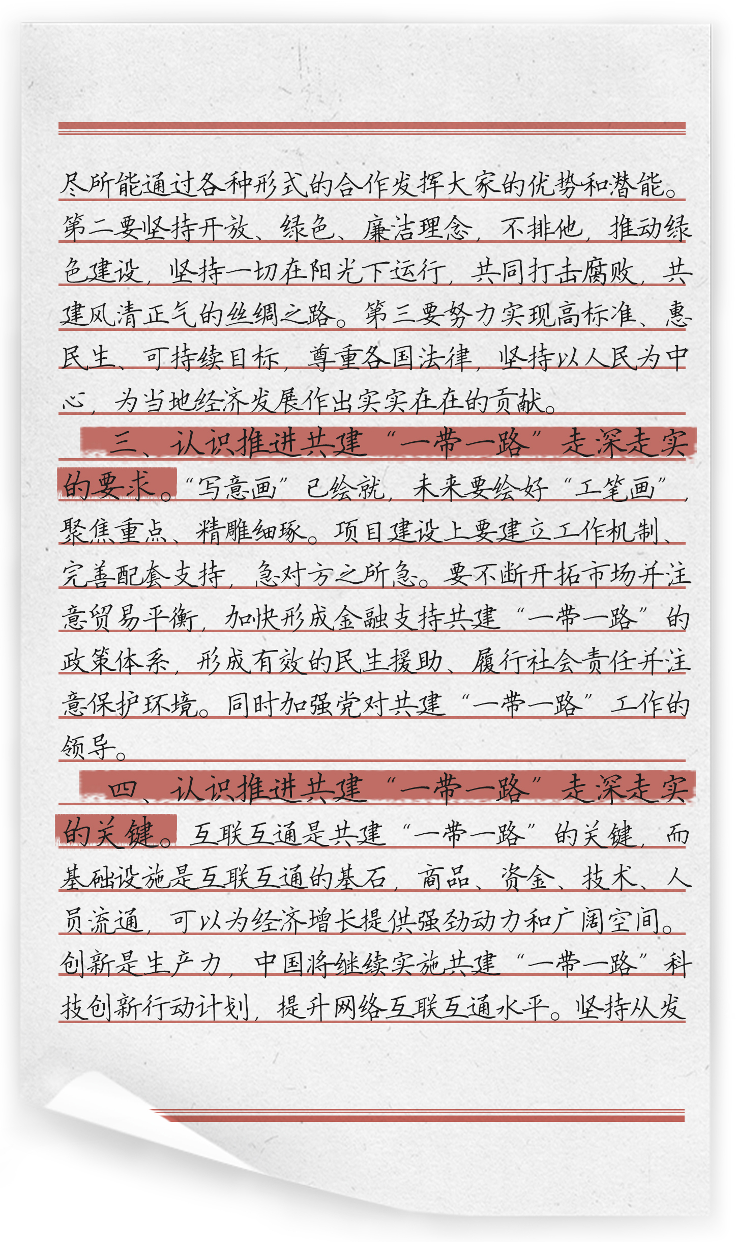 自2013年9月,习近平总书记在哈萨克斯坦纳扎尔巴耶夫大学作演讲,提出共同建设“丝绸之路经济带”的构思至今,“一带一路”建设已取得显著的成果。“作为《习近平谈治国理政》第三卷的第十八专题,推动共建‘一带一路’走深走实”这一专题共收录了习近平总书记2018年1月至2019年4月期间的4篇讲话或讲话要点、节选。第一篇《打造一条跨越太平洋的合作之路》中说到,要延续我们先辈开辟的中拉“太平洋海上丝绸之路”,共建“一带一路”新蓝图,打造一条跨越太平洋的合作之路,构建中拉更美好的明天。第二篇《加强战略和行动对接,携手推进“一带一路”建设》中说到,4年的携手同行全面带动中阿关系进入全方位合作的新阶段,中方愿同阿方加强战略和行动对接,并提出了未来两方推进“一带一路”建设的方向和方法。第三篇《共同绘制好“一带一路”的“工笔画”》总结了5年来“一带一路”建设所推动的中国的发展,重申了“一带一路”的性质,并提出了下一阶段推进“一带一路”工作的基本要求是在保持健康良性发展势头的基础上向高质量发展转变。第四篇《推动共建“一带一路”高质量发展》提出了推动“一带一路”高质量发展的原则,并指出共建“一带一路”,关键是互联互通,以及怎样互联互通。