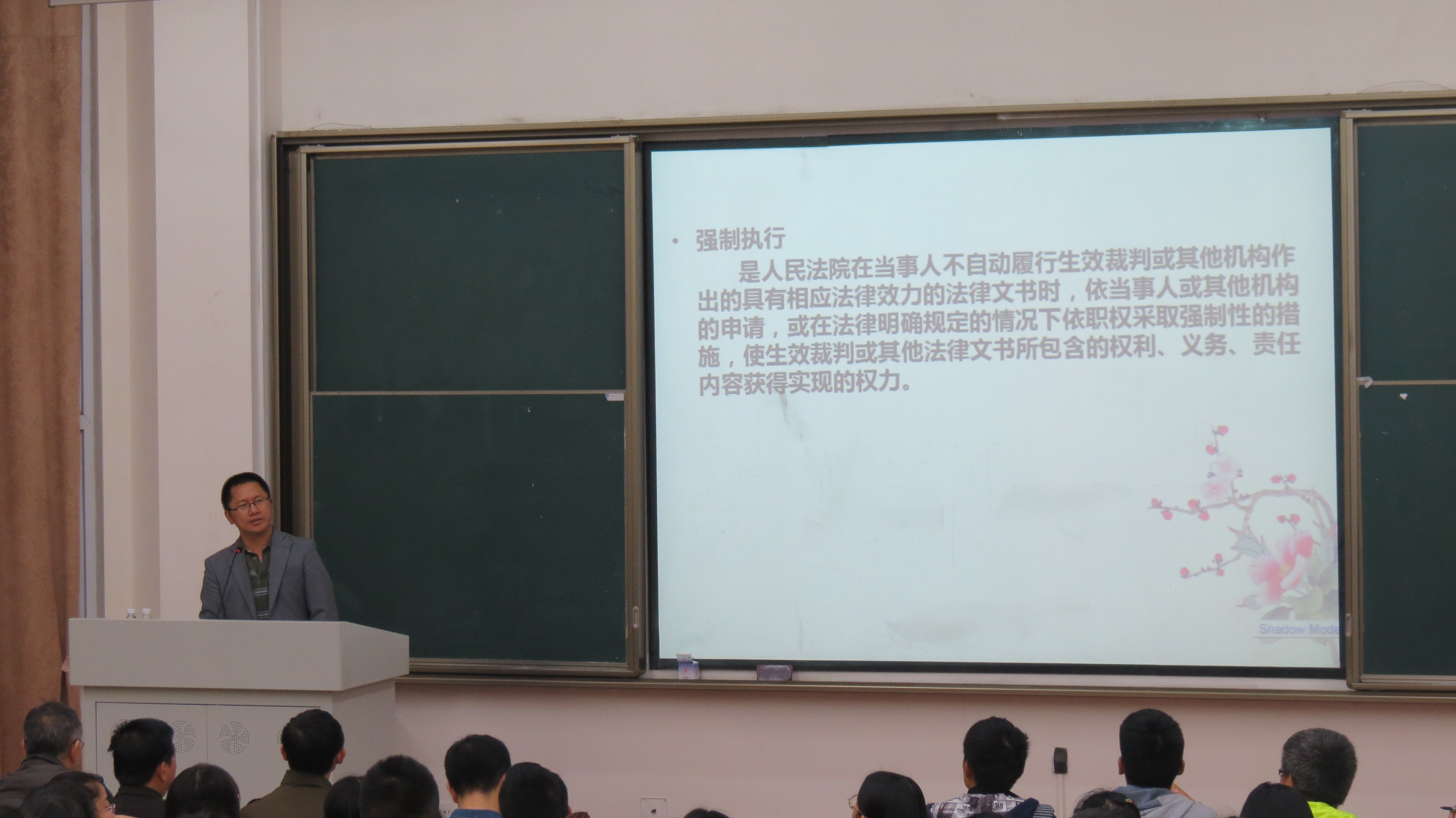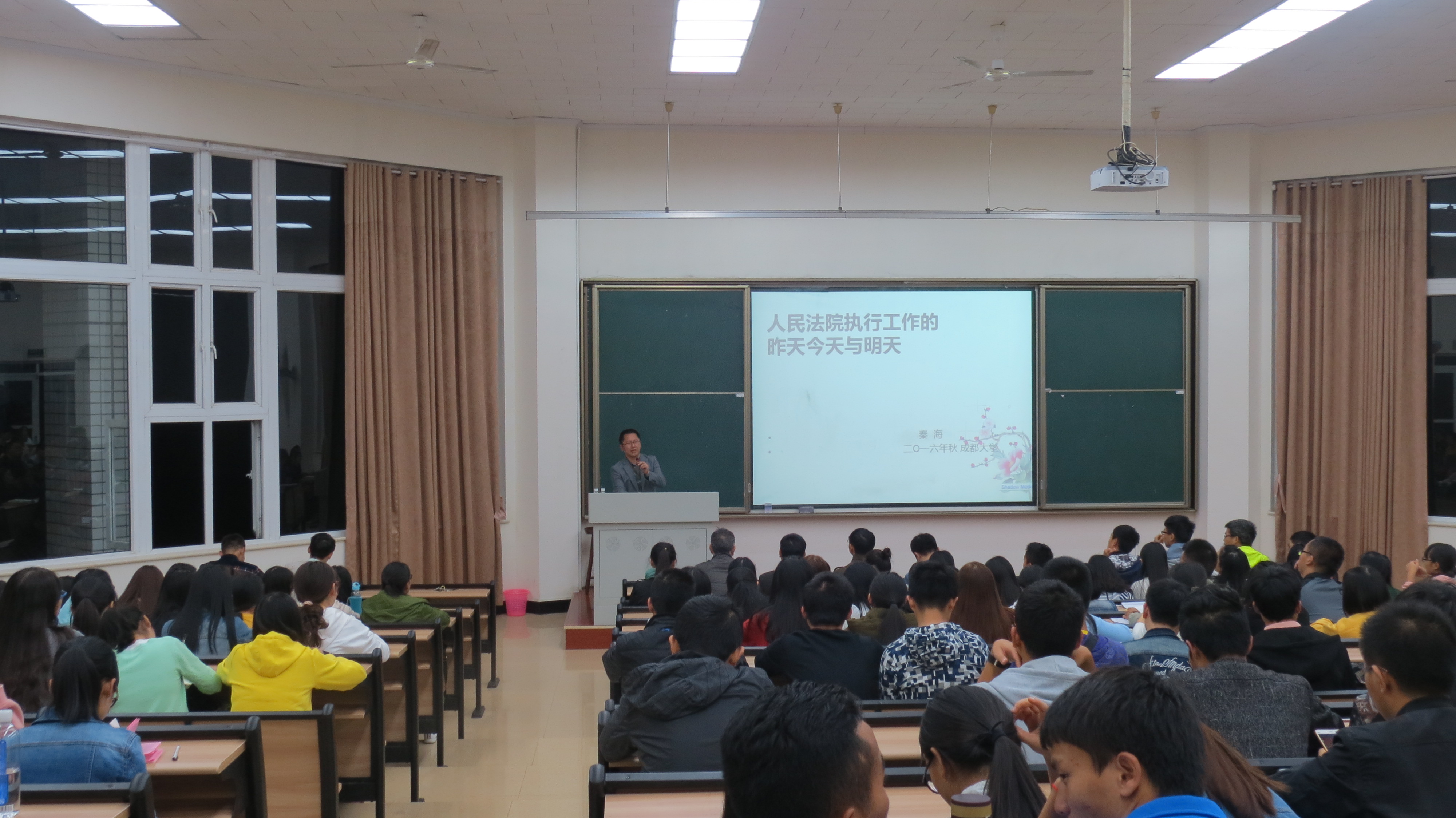 名师讲堂在第七教学楼202室隆重举行。本次讲座的主讲嘉宾是来自四川省高级人民法院办公室的秦海主任,讲座的题目是“中国民事强制执行的昨天、今天和明天”。政治学院院长彭时平教授、副院长邓陕峡教授、实验室主任刘剑老师、法学系张居盛教授、沈冬军博士出席了本次讲座。