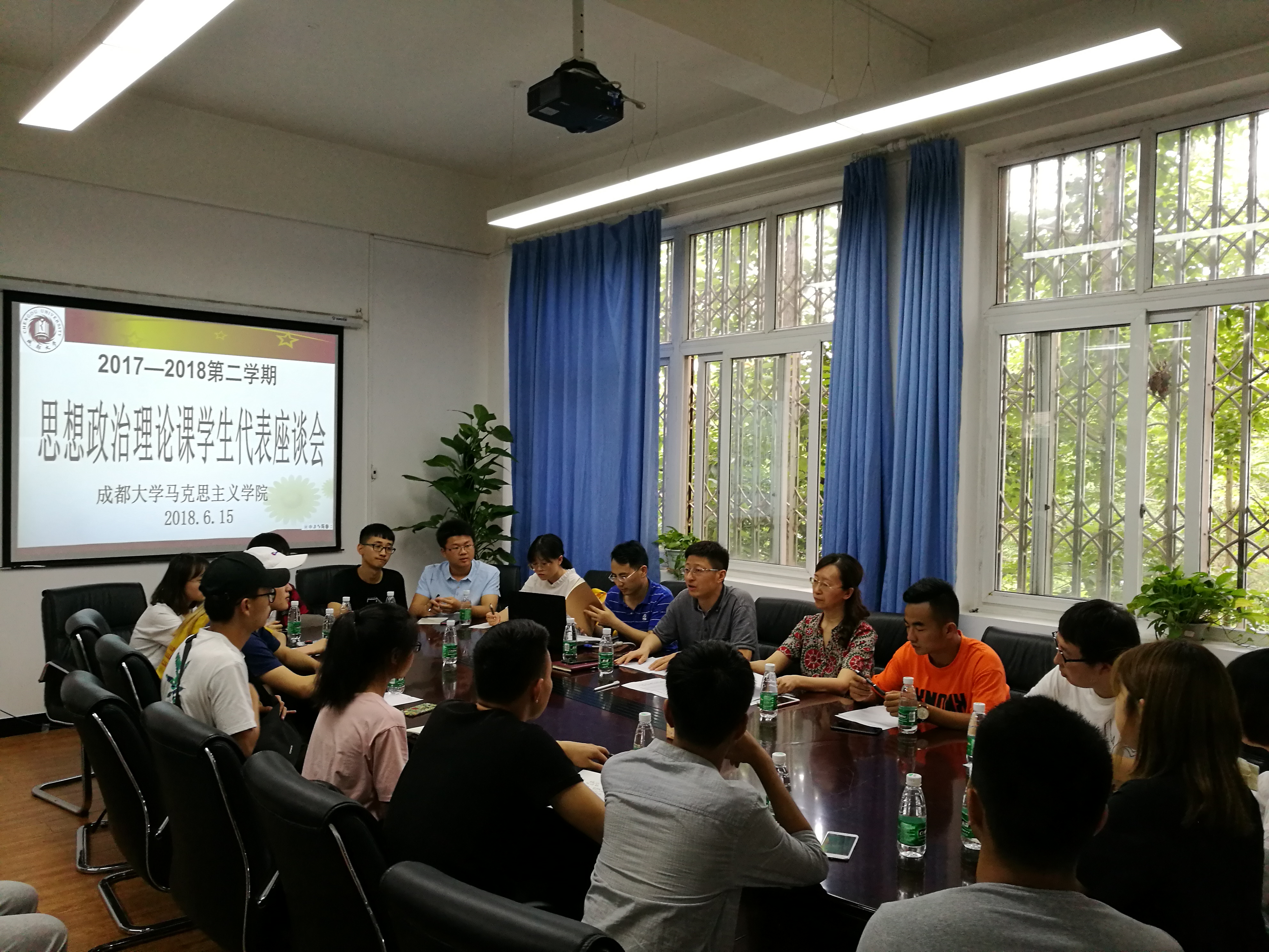 于2018年6月15日(星期五)下午在6224会议室召开2017-2018-2学期思想政治理论课学生代表座谈会,征求广大学生对本学期我校思想政治理论课教学和课程改革的意见和建议。来自全校15个学院的18名学生代表参加了座谈会,学院督导负责人倪怀敏教授、副院长屈陆教授和王建军老师一同参会。会议由屈陆副院长主持。