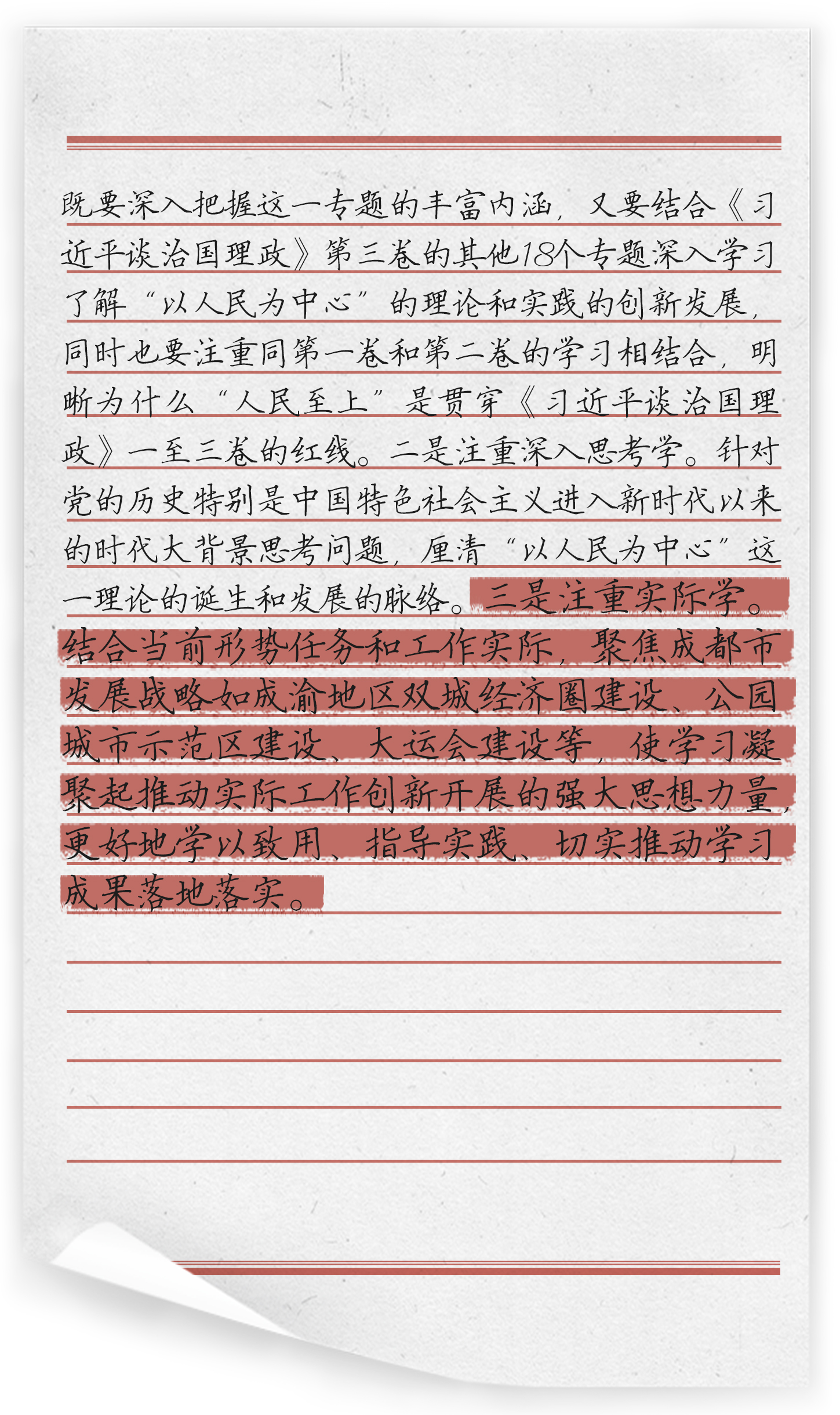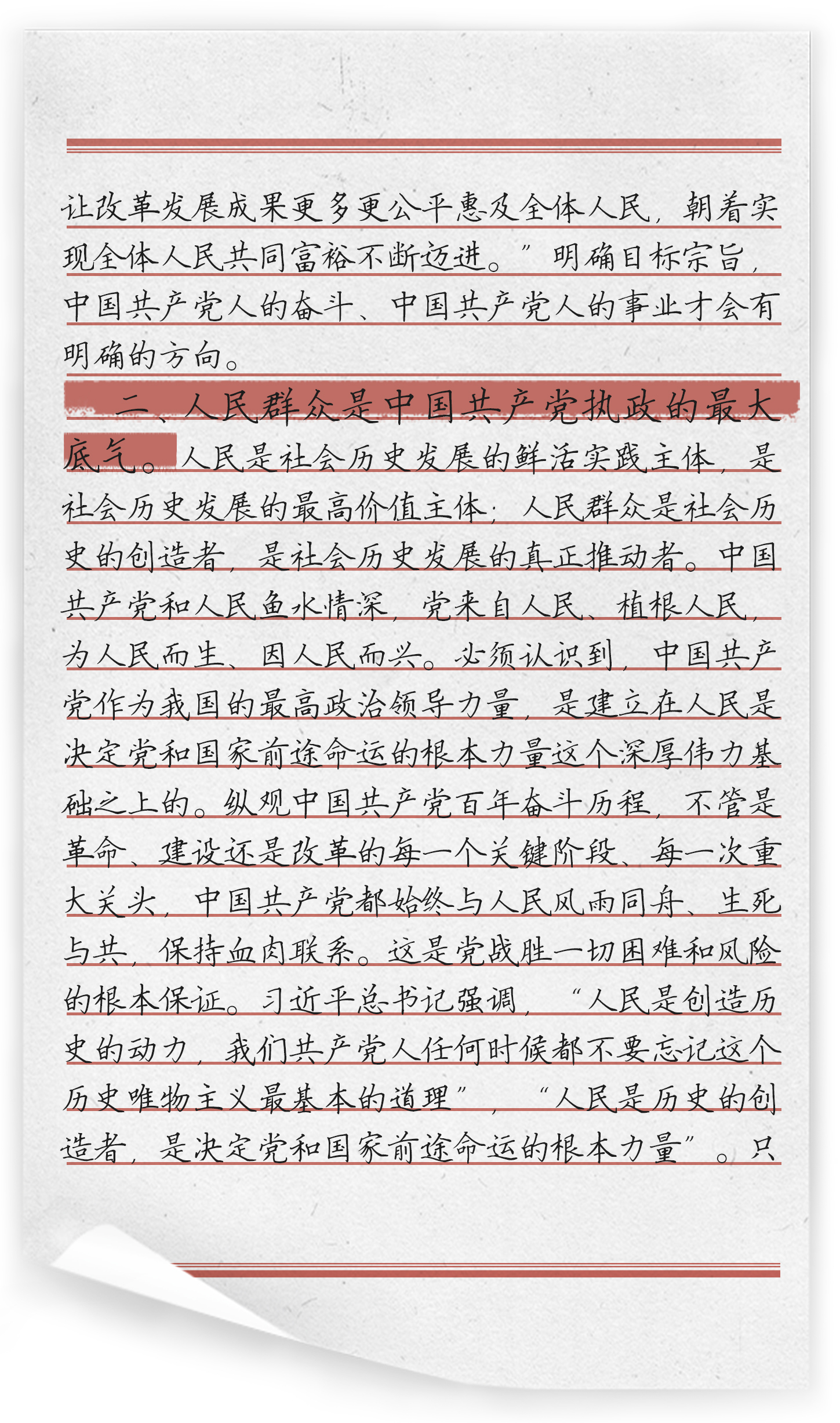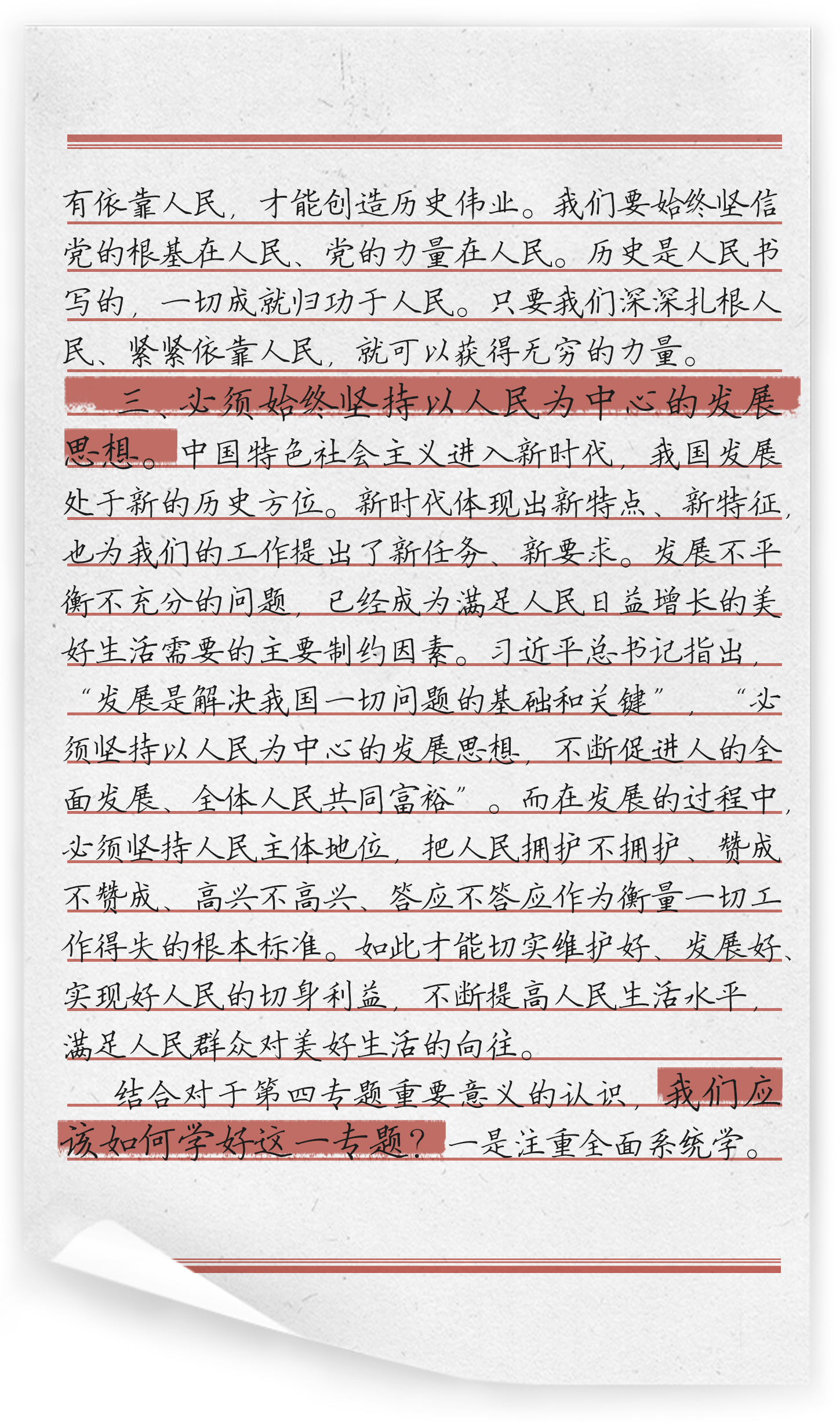 “人民是历史的创造者、人民是真正的英雄”。《习近平谈治国理政》第三卷第四专题“坚持以人民为中心”,共收录习近平总书记四篇重要著作,对坚持人民立场进行了深入阐述,丰富发展了马克思主义群众观的思想体系。认真研读本专题,可以真切感受到“人民至上”这条主线一以贯之,充分彰显了“坚持以人民为中心”这一新时代坚持和发展中国特色社会主义的根本立场。中国共产党之所以能在革命、建设和改革的过程中不断取得成功,很重要的一个原因就在于始终坚持以人民为中心,人民是我们党执政的最大底气。