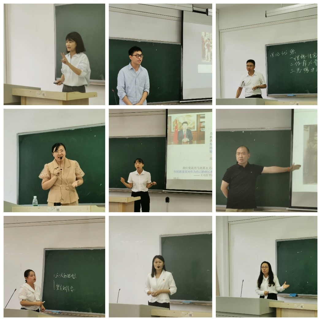 参加教学比赛决赛暨省赛课选拔赛的九名选手教师在赛前已提前进行了抽签,按抽签顺序依次上台进行了10分钟的现场教学展示。其中,1号选手吴立立老师展示的题目为《马克思主义联系观》,2号选手杨东晓老师展示的题目为《五四运动的导火索》,3号选手刘世炜老师展示的题目为《党的自身优势是中国特色社会主义制度优势的主要来源》,4号选手马琳老师展示的题目为《人民群众是历史的创造者》,5号选手邵蕊老师展示的题目为《中国梦归根到底是人民的梦》,6号选手彭波老师展示的题目为《从“鬼子兵”到反战斗士——中国共产党对日本战俘的成功改造》,7号选手李欧老师展示的题目为《为实现中国梦注入青春能量》,8号选手徐开玉老师展示的题目为《中国共产党的独特优势》,9号选手刘毅老师展示的题目为《我国社会主义法律的本质特征》。