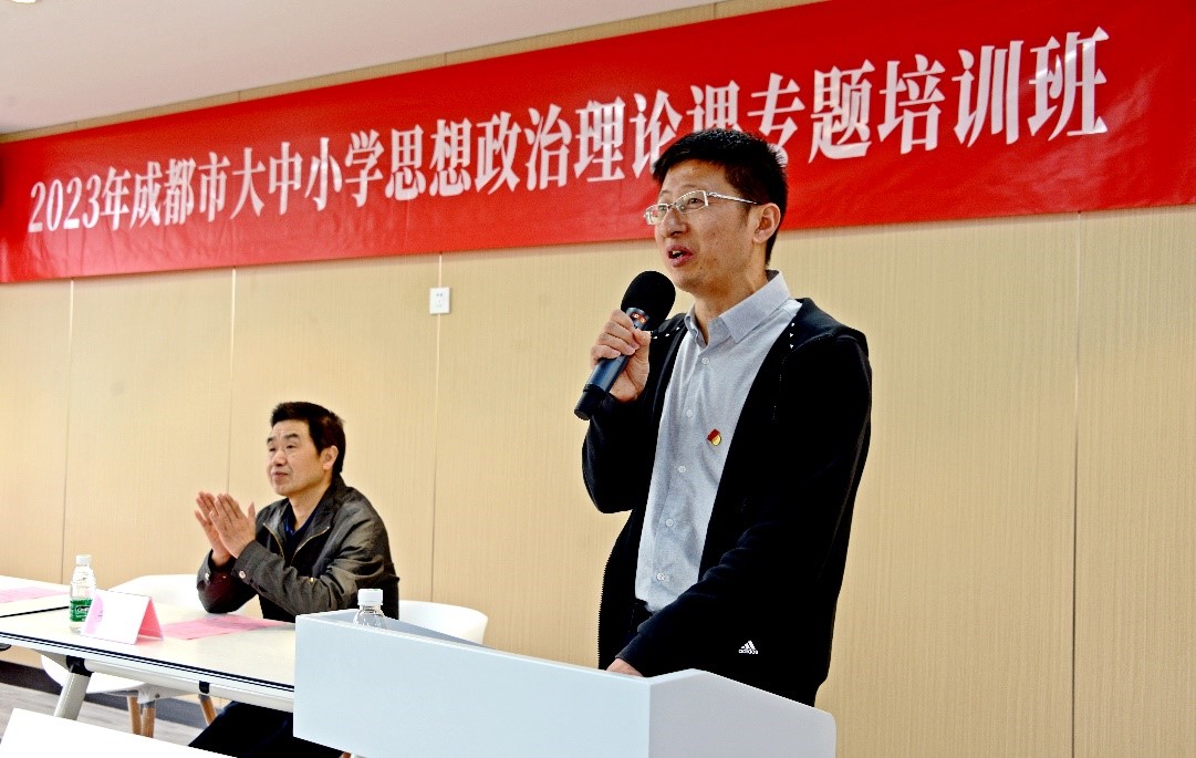 第四项议程由学员代表、邛崃市教研培训中心德育教研员、正高级教师杨军发言。杨军老师首先谈到了思想政治学习的重要性,并代表参训学员表态:将按照主办单位学习要求,以党员标准严格要求自己,严守纪律、认真学习,并将所学与教学实际结合,做用信仰之力开创学生美好未来的思政教育者。
