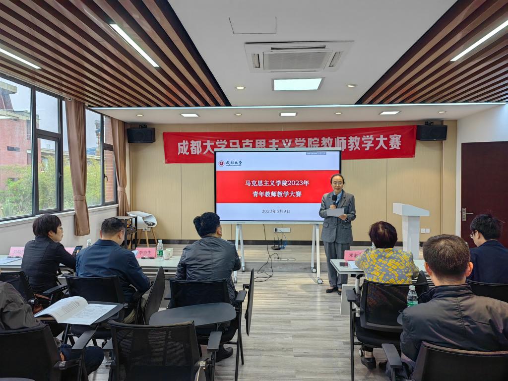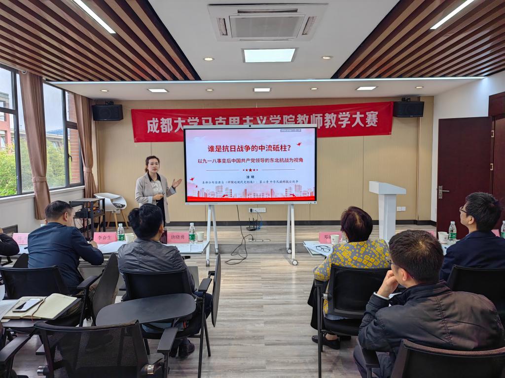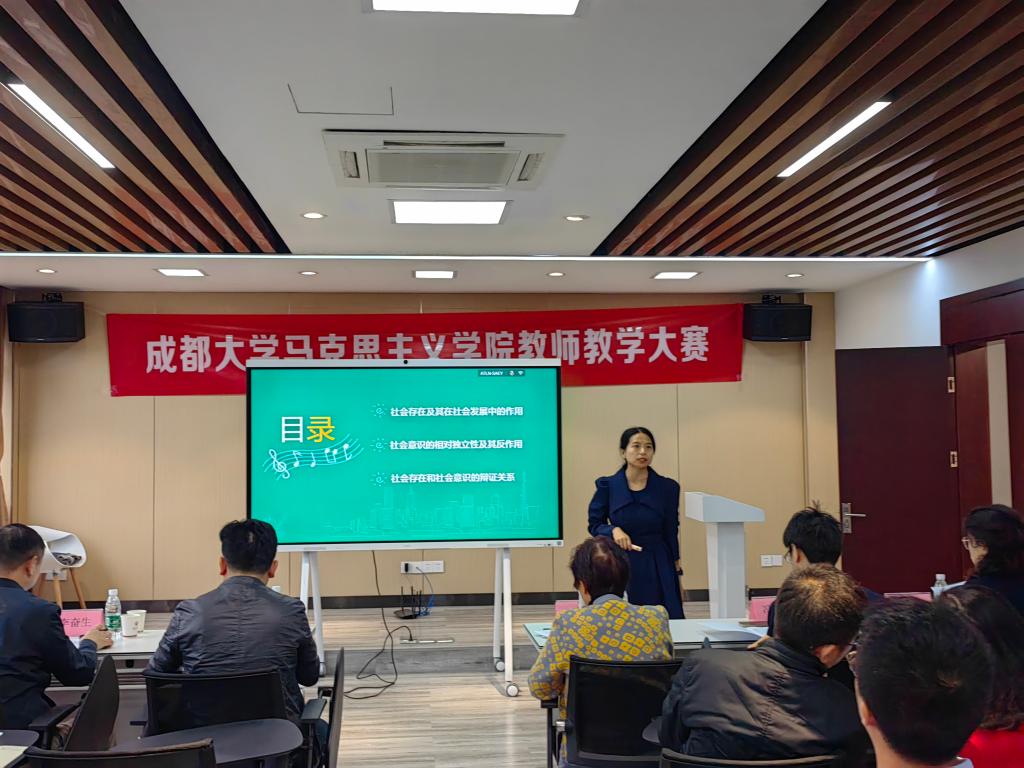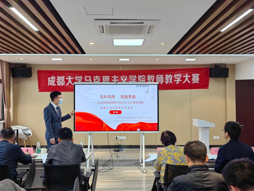 决赛前,每个教研室已进行了初赛,各教研室赛出2名、共计8名教师参加本次决赛。参赛教师在赛前已提前进行了抽签,按抽签顺序依次上台进行15分钟的现场教学展示。其中,1号选手梁爽老师展示的题目为《社会存在和社会意识》,2号选手祝秦老师展示的题目为《全过程人民民主》,3号选手凃玥老师展示的题目为《谁是抗日战争的中流砥柱?——以九一八事变后中国共产党领导的东北抗战为视角》,4号选手张猷老师展示的题目为《工人、白领和数字劳工——剩余价值的剥削方法》,5号选手杨运筹老师展示的题目为《新时代呼唤担当民族复兴大任的时代新青年》,6号选手朱昊老师展示的题目为《百年风雨 筑路梦成:从成渝铁路看新中国社会主义建设成就》,7号选手吴桐老师展示的题目为《坚持全面推进科学立法、严格执法、公正司法、全民守法》,8号选手向黎老师展示的题目为《如何争做堪当民族复兴重任的时代先锋?——做改革创新生力军》。