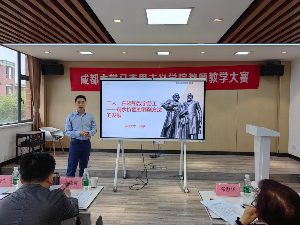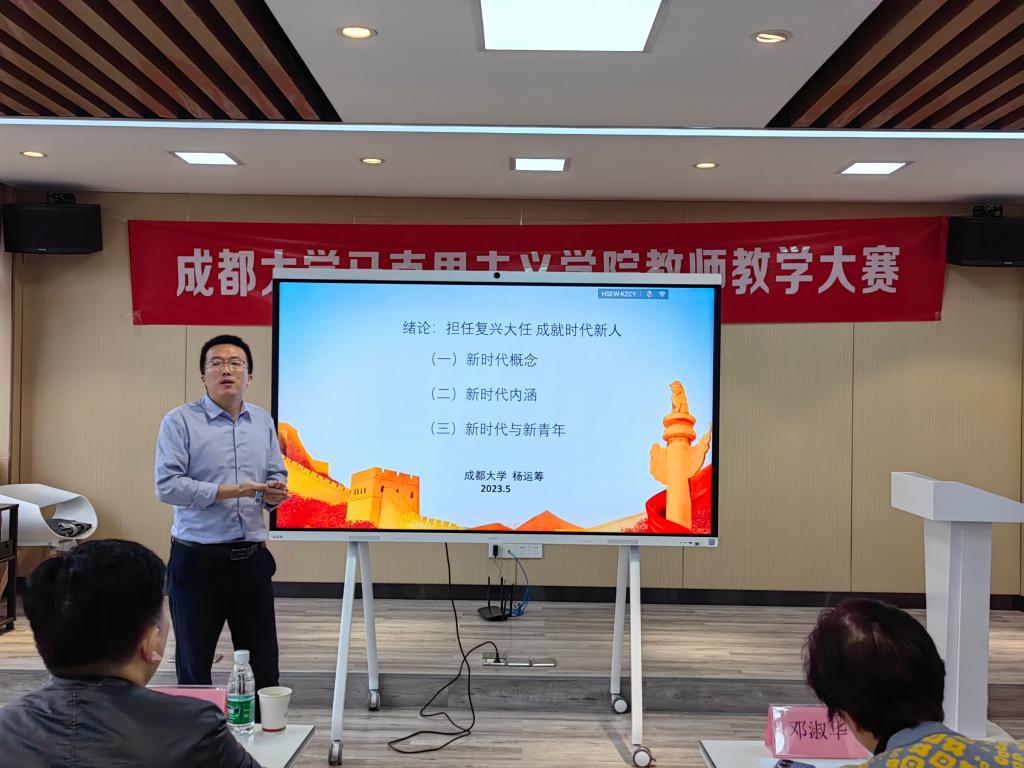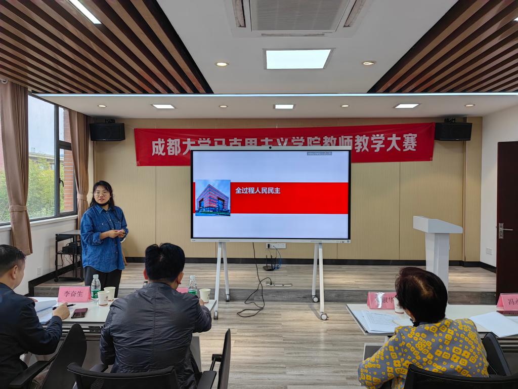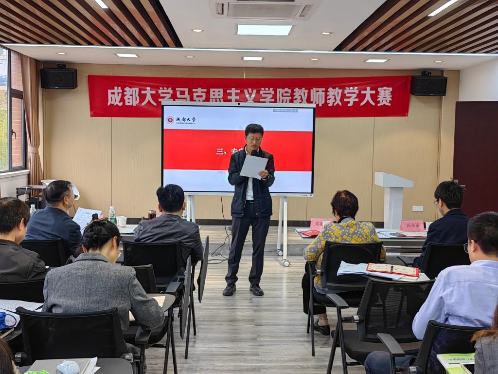 决赛前,每个教研室已进行了初赛,各教研室赛出2名、共计8名教师参加本次决赛。参赛教师在赛前已提前进行了抽签,按抽签顺序依次上台进行15分钟的现场教学展示。其中,1号选手梁爽老师展示的题目为《社会存在和社会意识》,2号选手祝秦老师展示的题目为《全过程人民民主》,3号选手凃玥老师展示的题目为《谁是抗日战争的中流砥柱?——以九一八事变后中国共产党领导的东北抗战为视角》,4号选手张猷老师展示的题目为《工人、白领和数字劳工——剩余价值的剥削方法》,5号选手杨运筹老师展示的题目为《新时代呼唤担当民族复兴大任的时代新青年》,6号选手朱昊老师展示的题目为《百年风雨 筑路梦成:从成渝铁路看新中国社会主义建设成就》,7号选手吴桐老师展示的题目为《坚持全面推进科学立法、严格执法、公正司法、全民守法》,8号选手向黎老师展示的题目为《如何争做堪当民族复兴重任的时代先锋?——做改革创新生力军》。