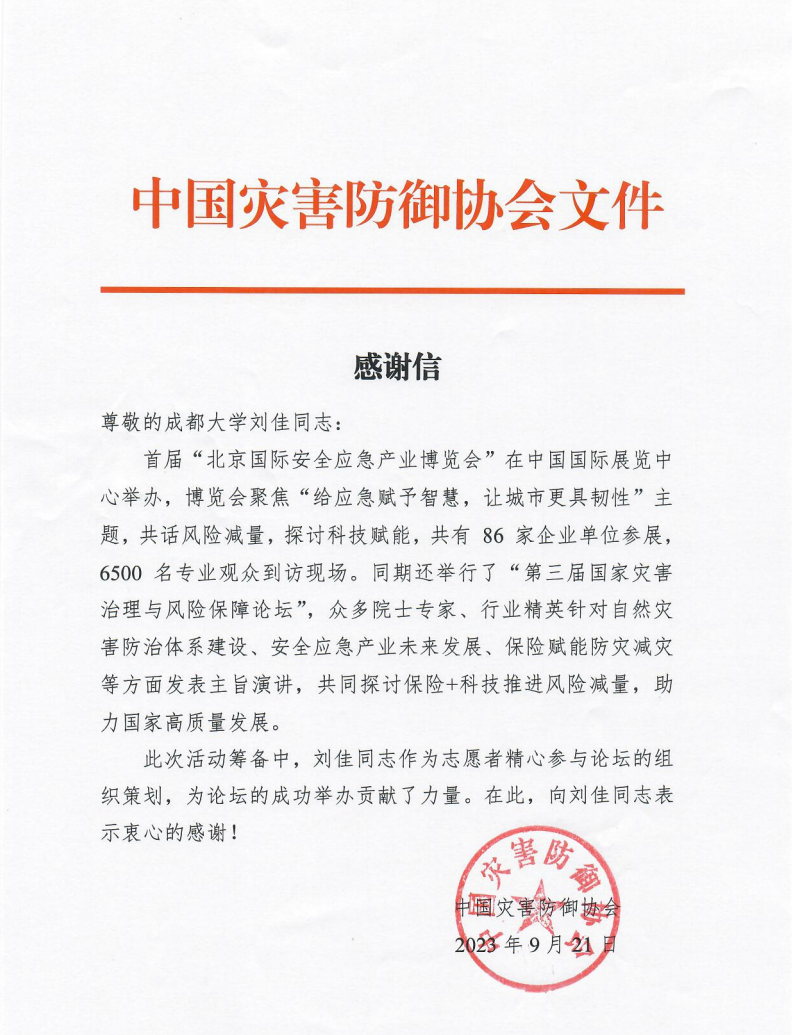 9月6日,由中国灾害防御协会主办的2023北京国际安全应急产业博览会、第三届国家灾害治理与风险保障论坛暨“灾害防御科学技术奖”颁奖仪式在北京举行,大会主题为“给应急赋予智慧,让城市更具韧性”。第十二届全国政协副主席马培华、国家减灾委秘书长郑国光等50位领导专家致辞和发言,众多院士专家、行业精英发表主旨演讲,共同探讨保险+科技推进风险减量,助力国家高质量发展。