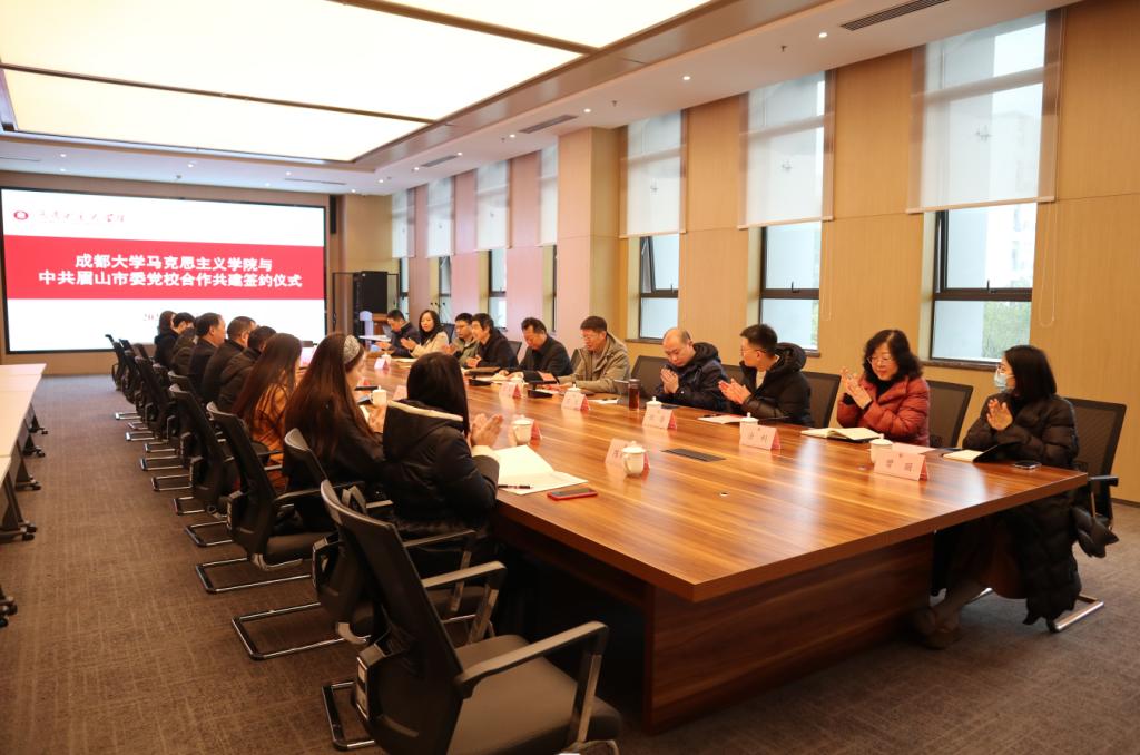 的基本情况。胡书记表示,高校马院有理论上的优势,地方党校有实践上的特色,双方的合作有利于优势互补、推动发展,并对下一步合作共建在实践基地、课题申报、人员交流等多方面提出建议。眉山市委党校副校长向建民介绍了眉山市委党校的情况。向校长表示,眉山市委党校有东坡文化建设和乡村振兴理论建设方面有优势和特色,双方共建能够实现资源互补,推动理论与实践的深度融合,期待通过合作,打造一批具有地方特色、理论深度和实践指导性的高水平成果。