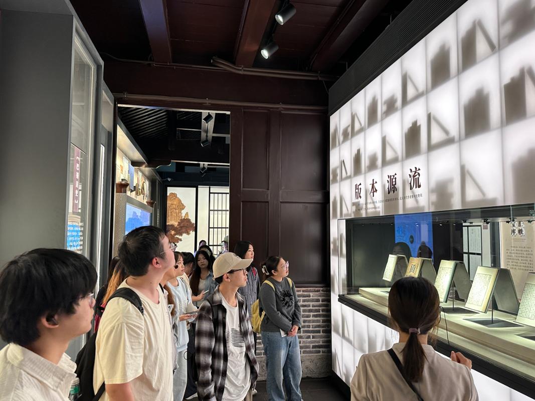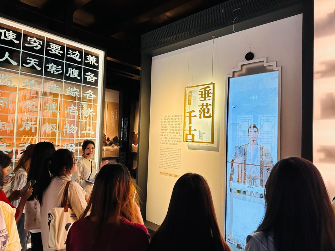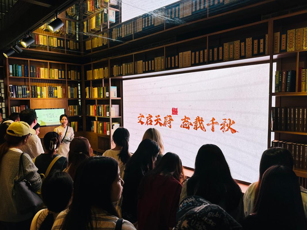 步入“史学巨擘”展区,“江左修书”场景还原则让同学们身临其境体会常璩“情系生民、丹心著史”的治学精神;在“垂范千古”展区,华阳长卷光影沉浸空间用科技手段演绎蜀地风物与农技发展,而方志阁内收藏的3000余本西南地区方志典籍,让同学们深刻认识到《华阳国志》作为天府文化文献宝库的深远影响。参观中,同学们借助 AI 互动装置与常璩“跨时空对话”,在触控屏上查阅方志原文,现场学习氛围浓厚。