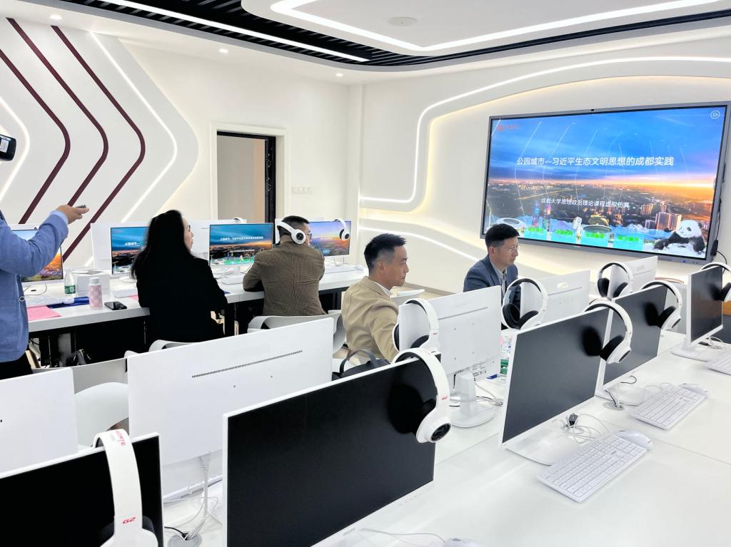 接着,习近平新时代中国特色社会主义思想概论教研室主任侯幸汇报《公园城市——习近平生态文明思想的成都实践》课程的建设情况、软件的使用情况和未来的发展规划。然后邀请评审专家、市委宣传部的工作人员体验PC版、VR头盔版本软件。评审专家体验后也提出相关意见与建议,对后面更好地利用仿真实验室进行数字赋能对思政课宣传教育具有重要指导作用。