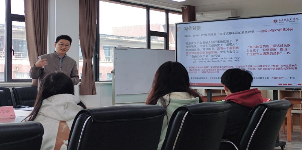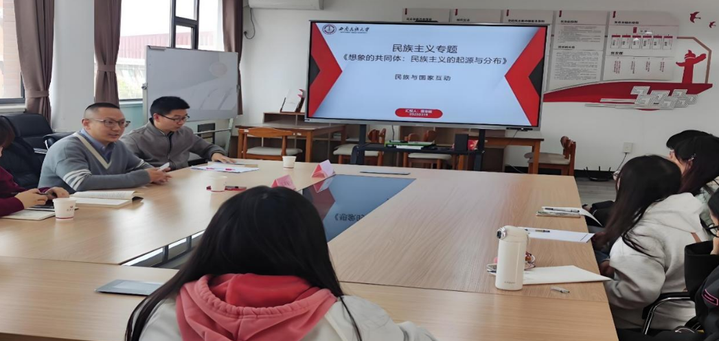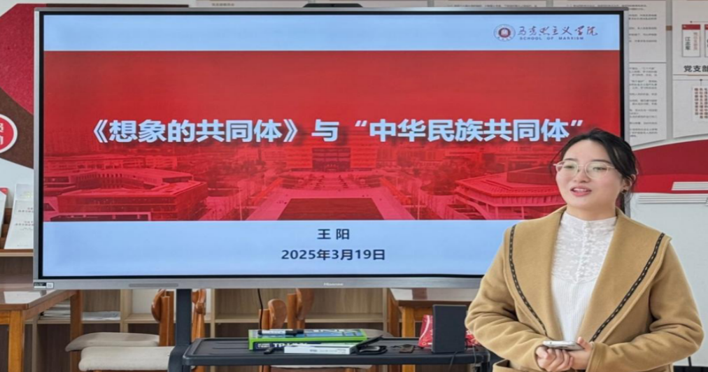 3月19日下午,学院在一教1407会议室举办了本学期第一次读书会。本次读书会分享的书目是本尼迪克特·安德森的经典著作《想象的共同体》,学院王阳博士老师主讲,来自西南民族大学国家民委中华民族共同体研究基地研究员苏韦铨博士与谈,研究生杜苗同学主持。读书会吸引了我校文新学院李建峰副教授、马院青年教师、研究生、青马协会同学们热情参与。