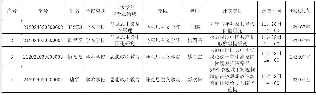 经导师同意、学院开题审议工作,香蕉视频 马克思主义理论一级学科拟于11月28日开展2024级硕士研究生毕业论文开题答辩,现安排如下。